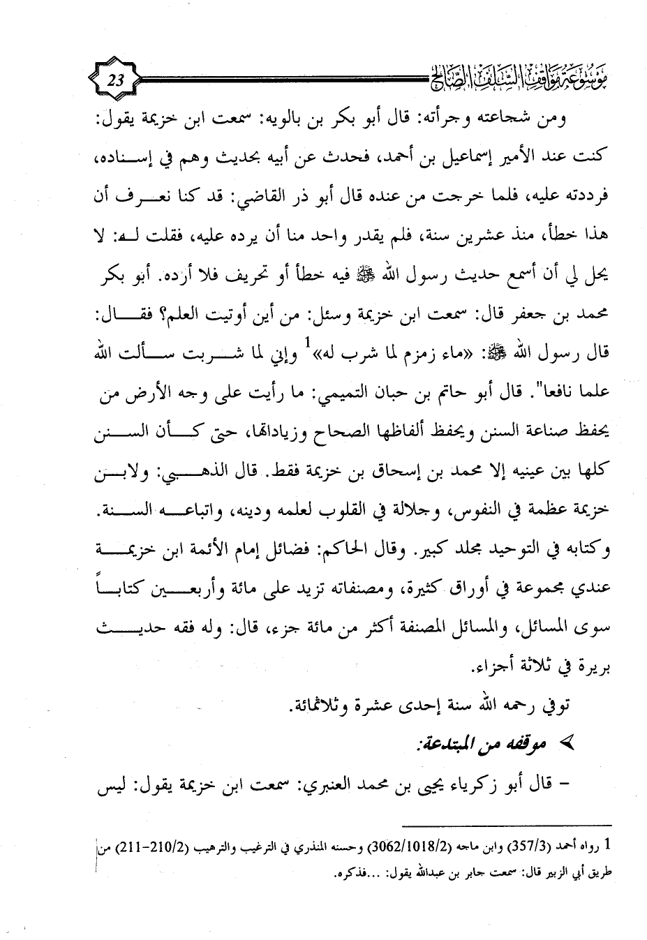 ومن شجاعته وجرأته: قال أبو بكر بن بالويه: سمعت ابن خزيمة يقول: كنت عند الأمير إسماعيل بن أحمد، فحدث عن أبيه بحديث وهم في إسناده، فرددته عليه، فلما خرجت من عنده قال أبو ذر القاضي: قد كنا نعرف أن هذا خطأ، منذ عشرين سنة، فلم يقدر واحد منا أن يرده عليه، فقلت له: لا يحل لي أن أسمع حديث رسول الله - صلى الله عليه وسلم - فيه خطأ أو تحريف فلا أرده. أبو بكر محمد بن جعفر قال: سمعت ابن خزيمة وسئل: من أين أوتيت العلم؟ فقال: قال رسول الله - صلى الله عليه وسلم -: "ماء زمزم لما شرب له" (¬1) وإني لما شربت سألت الله علما نافعا". قال أبو حاتم بن حبان التميمي: ما رأيت على وجه الأرض من يحفظ صناعة السنن ويحفظ ألفاظها الصحاح وزياداتها، حتى كأن السنن كلها بين عينيه إلا محمد بن إسحاق بن خزيمة فقط. قال الذهبي: ولابن خزيمة عظمة في النفوس، وجلالة في القلوب لعلمه ودينه، واتباعه السنة. وكتابه في التوحيد مجلد كبير. وقال الحاكم: فضائل إمام الأئمة ابن خزيمة عندي مجموعة في أوراق كثيرة، ومصنفاته تزيد على مائة وأربعين كتاباً سوى المسائل، والمسائل المصنفة أكثر من مائة جزء، قال: وله فقه حديث بريرة في ثلاثة أجزاء.