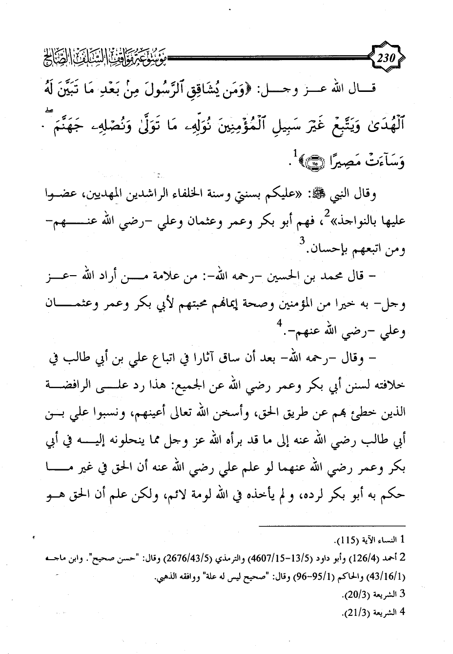 وقال النبي - صلى الله عليه وسلم -: "عليكم بسنتي وسنة الخلفاء الراشدين المهديين، عضوا عليها بالنواجذ" (¬2)، فهم أبو بكر وعمر وعثمان وعلي -رضي الله عنهم- ومن اتبعهم بإحسان. (¬3)