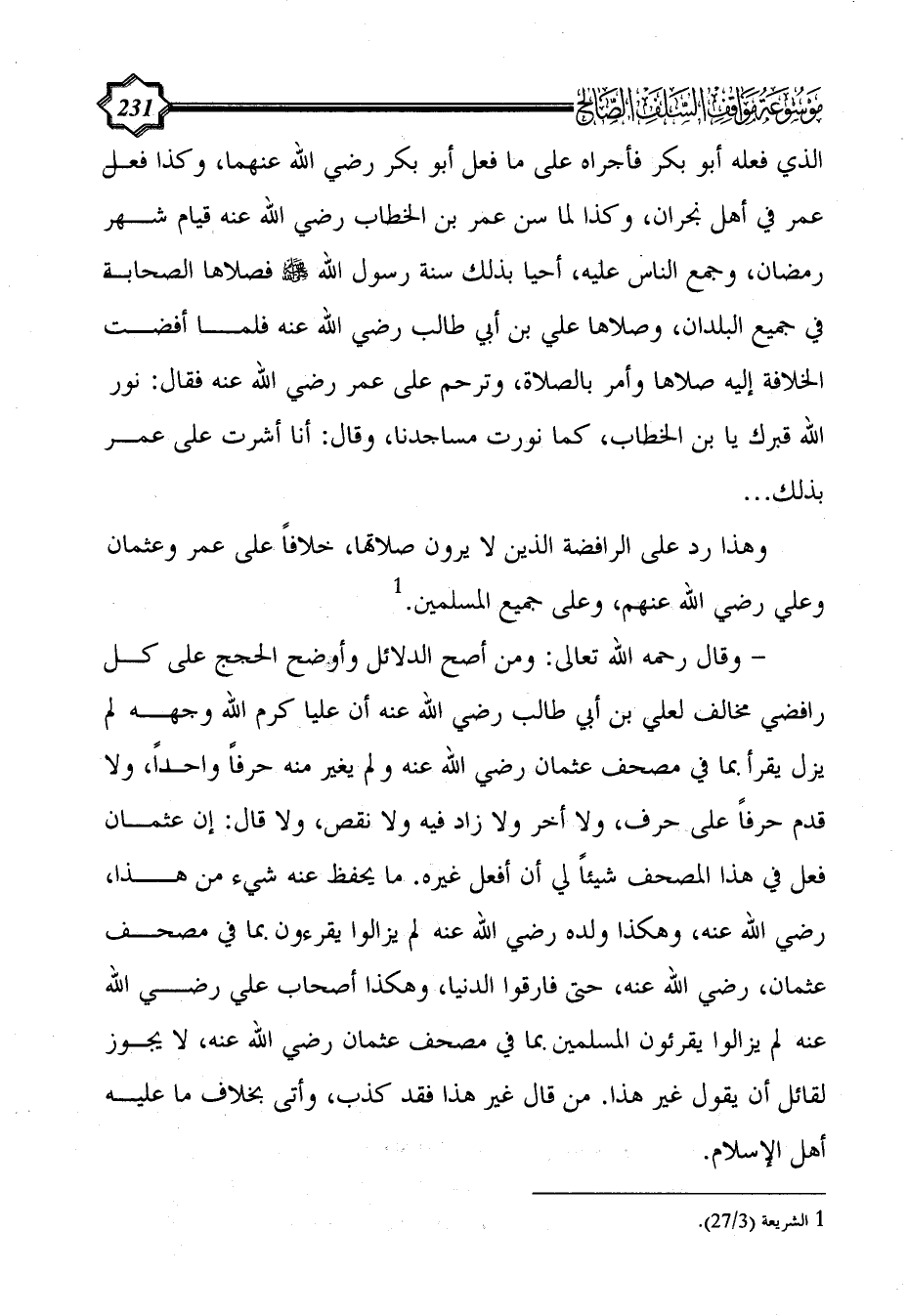 - وقال رحمه الله تعالى: ومن أصح الدلائل وأوضح الحجج على كل رافضي مخالف لعلي بن أبي طالب رضي الله عنه أن عليا كرم الله وجهه لم يزل يقرأ بما في مصحف عثمان رضي الله عنه ولم يغير منه حرفاً واحداً، ولا قدم حرفاً على حرف، ولا أخر ولا زاد فيه ولا نقص، ولا قال: إن عثمان فعل في هذا المصحف شيئاً لي أن أفعل غيره. ما يحفظ عنه شيء من هذا، رضي الله عنه، وهكذا ولده رضي الله عنه لم يزالوا يقرءون بما في مصحف عثمان، رضي الله عنه، حتى فارقوا الدنيا، وهكذا أصحاب علي رضي الله عنه لم يزالوا يقرئون المسلمين بما في مصحف عثمان رضي الله عنه، لا يجوز لقائل أن يقول غير هذا. من قال غير هذا فقد كذب، وأتى بخلاف ما عليه أهل الإسلام.