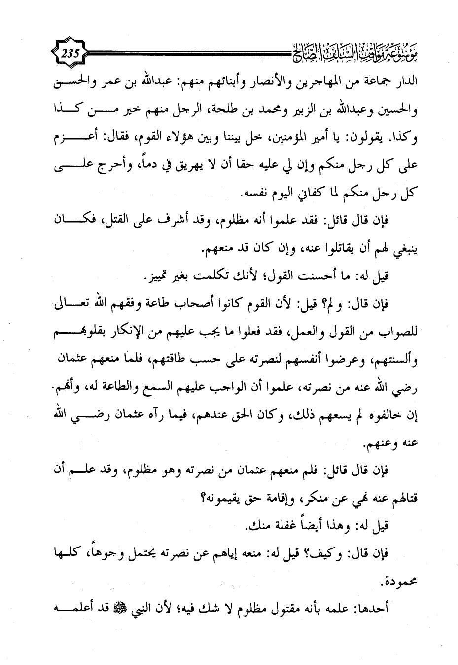 فإن قال: ولم؟ قيل: لأن القوم كانوا أصحاب طاعة وفقهم الله تعالى للصواب من القول والعمل، فقد فعلوا ما يجب عليهم من الإنكار بقلوبهم وألسنتهم، وعرضوا أنفسهم لنصرته على حسب طاقتهم، فلما منعهم عثمان رضي الله عنه من نصرته، علموا أن الواجب عليهم السمع والطاعة له، وأنهم إن خالفوه لم يسعهم ذلك، وكان الحق عندهم، فيما رآه عثمان رضي الله عنه وعنهم.