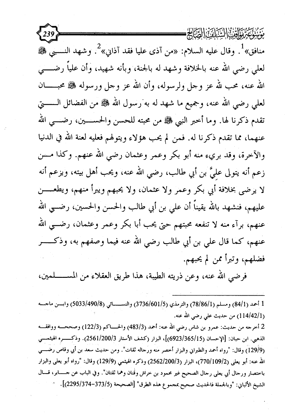 منافق" (¬1). وقال عليه السلام: "من آذى عليا فقد آذاني" (¬2). وشهد النبي - صلى الله عليه وسلم - لعلي رضي الله عنه بالخلافة وشهد له بالجنة، وبأنه شهيد، وأن علياً رضي الله عنه، محب لله عز وجل ولرسوله، وأن الله عز وجل ورسوله - صلى الله عليه وسلم - محبان لعلي رضي الله عنه، وجميع ما شهد له به رسول الله - صلى الله عليه وسلم - من الفضائل التي تقدم ذكرنا لها. وما أخبر النبي - صلى الله عليه وسلم - من محبته للحسن والحسين، رضي الله عنهما، مما تقدم ذكرنا له. فمن لم يحب هؤلاء ويتولهم فعليه لعنة الله في الدنيا والآخرة، وقد بريء منه أبو بكر وعمر وعثمان رضي الله عنهم.