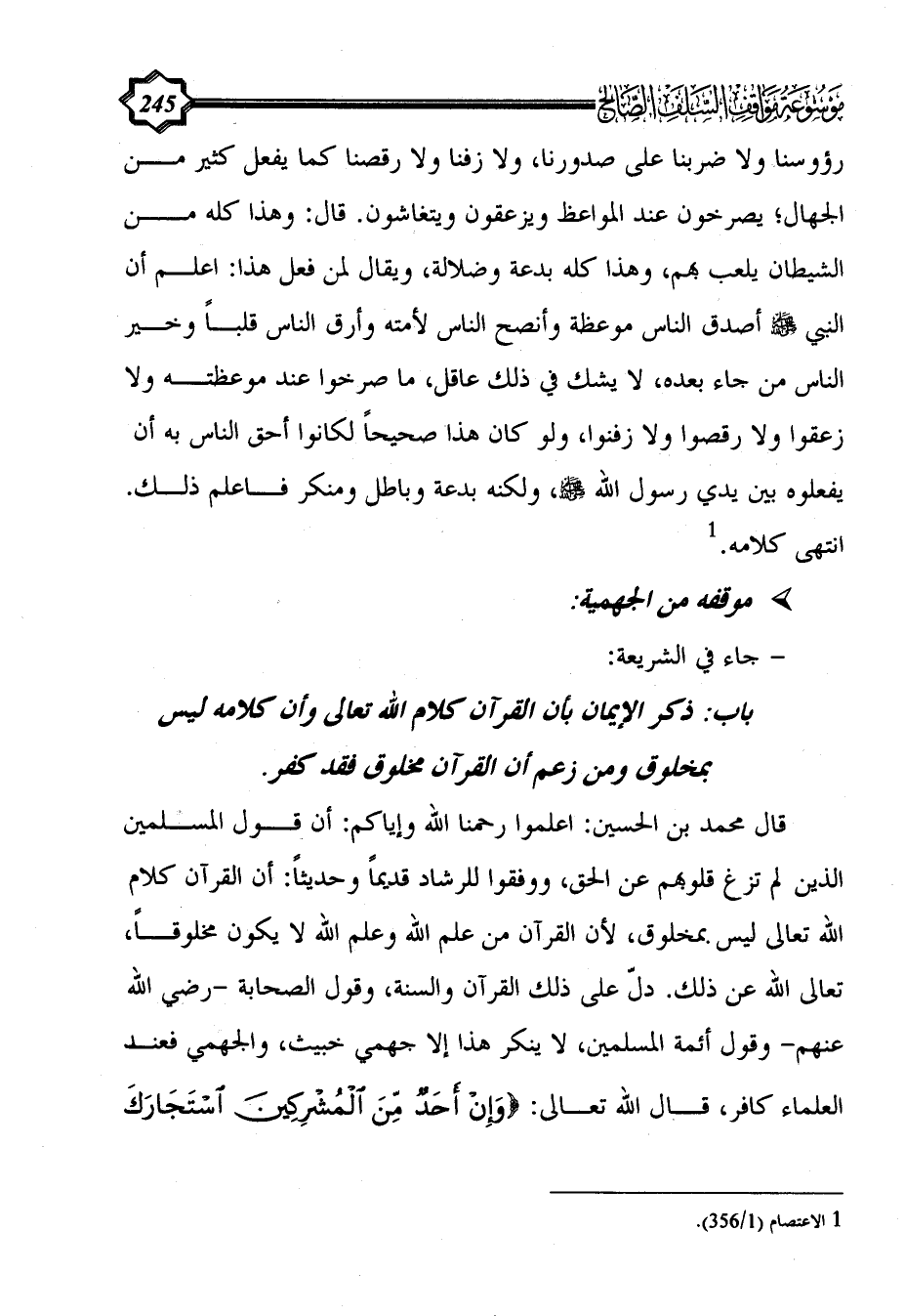 قال محمد بن الحسين: اعلموا رحمنا الله وإياكم: أن قول المسلمين الذين لم تزغ قلوبهم عن الحق، ووفقوا للرشاد قديماً وحديثاً: أن القرآن كلام الله تعالى ليس بمخلوق، لأن القرآن من علم الله وعلم الله لا يكون مخلوقاً، تعالى الله عن ذلك. دلّ على ذلك القرآن والسنة، وقول الصحابة -رضي الله عنهم- وقول أئمة المسلمين، لا ينكر هذا إلا جهمي خبيث، والجهمي فعند العلماء كافر، قال الله تعالى: {وَإِنْ أَحَدٌ مِنَ الْمُشْرِكِينَ اسْتَجَارَكَ