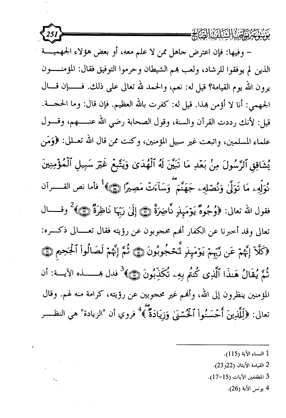 - وفيها: فإن اعترض جاهل ممن لا علم معه، أو بعض هؤلاء الجهمية الذين لم يوفقوا للرشاد، ولعب بهم الشيطان وحرموا التوفيق فقال: المؤمنون يرون الله يوم القيامة؟ قيل له: نعم، والحمد لله تعالى على ذلك. فإن قال الجهمي: أنا لا أؤمن بهذا. قيل له: كفرت بالله العظيم. فإن قال: وما الحجة. قيل: لأنك رددت القرآن والسنة، وقول الصحابة رضي الله عنهم، وقول علماء المسلمين، واتبعت غير سبيل المؤمنين، وكنت ممن قال الله تعالى: {وَمَنْ يُشَاقِقِ الرَّسُولَ مِنْ بَعْدِ مَا تَبَيَّنَ لَهُ الْهُدَى وَيَتَّبِعْ غَيْرَ سَبِيلِ الْمُؤْمِنِينَ نُوَلِّهِ مَا تَوَلَّى وَنُصْلِهِ جَهَنَّمَ وَسَاءَتْ مَصِيرًا} (¬1) فأما نص القرآن فقول الله تعالى: {وُجُوهٌ يَوْمَئِذٍ نَاضِرَةٌ (22) إِلَى رَبِّهَا نَاظِرَةٌ} (23) (¬2) وقال تعالى وقد أخبرنا عن الكفار أنهم محجوبون عن رؤيته فقال تعالى ذكره: {كَلَّا إِنَّهُمْ عَنْ رَبِّهِمْ يَوْمَئِذٍ لَمَحْجُوبُونَ (15) ثُمَّ إِنَّهُمْ لَصَالُو الْجَحِيمِ (16) ثُمَّ يُقَالُ هَذَا الَّذِي كُنْتُمْ بِهِ تُكَذِّبُونَ} (¬3) فدل بهذه الآية: أن المؤمنين ينظرون إلى الله، وأنهم غير محجوبين عن رؤيته، كرامة منه لهم. وقال تعالى: {لِلَّذِينَ أَحْسَنُوا الْحُسْنَى وزيادة} (¬4) فروي أن "الزيادة" هي النظر