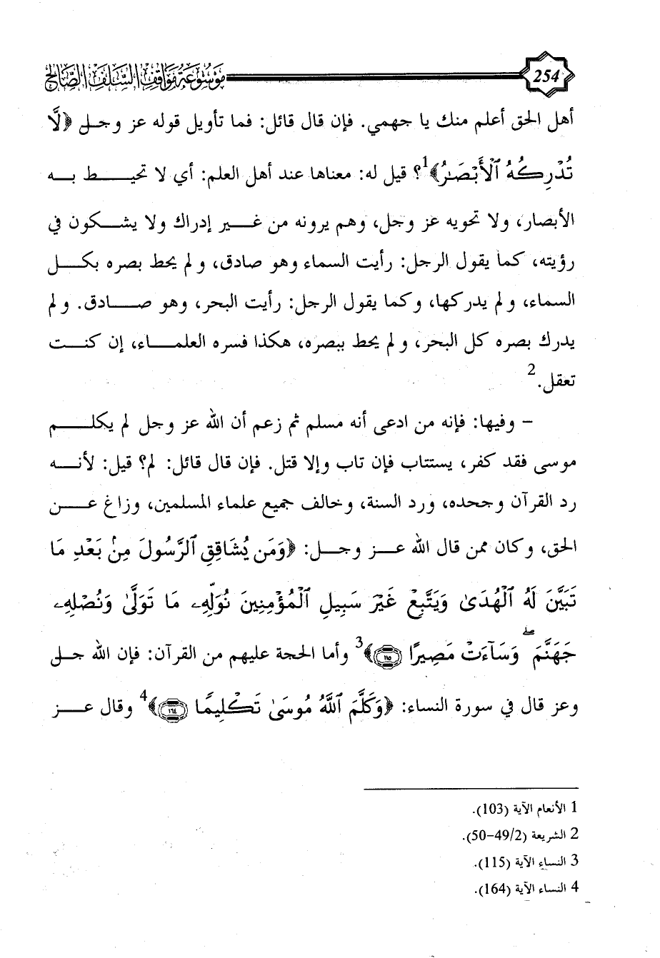 - وفيها: فإنه من ادعى أنه مسلم ثم زعم أن الله عز وجل لم يكلم موسى فقد كفر، يستتاب فإن تاب وإلا قتل. فإن قال قائل: لم؟ قيل: لأنه رد القرآن وجحده، ورد السنة، وخالف جميع علماء المسلمين، وزاغ عن الحق، وكان ممن قال الله عز وجل: {وَمَنْ يُشَاقِقِ الرَّسُولَ مِنْ بَعْدِ مَا تَبَيَّنَ لَهُ الْهُدَى وَيَتَّبِعْ غَيْرَ سَبِيلِ الْمُؤْمِنِينَ نُوَلِّهِ مَا تَوَلَّى وَنُصْلِهِ جَهَنَّمَ وَسَاءَتْ مَصِيرًا} (¬3) وأما الحجة عليهم من القرآن: فإن الله جل وعز قال في سورة النساء: {وكلم الله موسى تكليمًا} (¬4) وقال عز