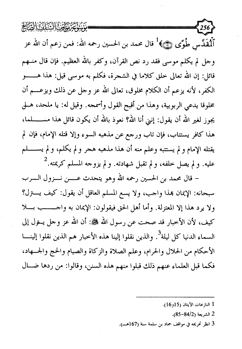 الْمُقَدَّسِ طُوًى} (¬1) قال محمد بن الحسين رحمه الله: فمن زعم أن الله عز وجل لم يكلم موسى فقد رد نص القرآن، وكفر بالله العظيم. فإن قال منهم قائل: إن الله تعالى خلق كلاماً في الشجرة، فكلم به موسى قيل: هذا هو الكفر، لأنه يزعم أن الكلام مخلوق، تعالى الله عز وجل عن ذلك ويزعم أن مخلوقاً يدعي الربوبية، وهذا من أقبح القول وأسمجه. وقيل له: يا ملحد، هل يجوز لغير الله أن يقول: إنني أنا الله؟ نعوذ بالله أن يكون قائل هذا مسلما، هذا كافر يستتاب، فإن تاب ورجع عن مذهبه السوء وإلا قتله الإمام، فإن لم يقتله الإمام ولم يستتبه وعلم منه أن هذا مذهبه هجر ولم يكلم، ولم يسلم عليه. ولم يصل خلفه، ولم تقبل شهادته. ولم يزوجه المسلم كريمته. (¬2)