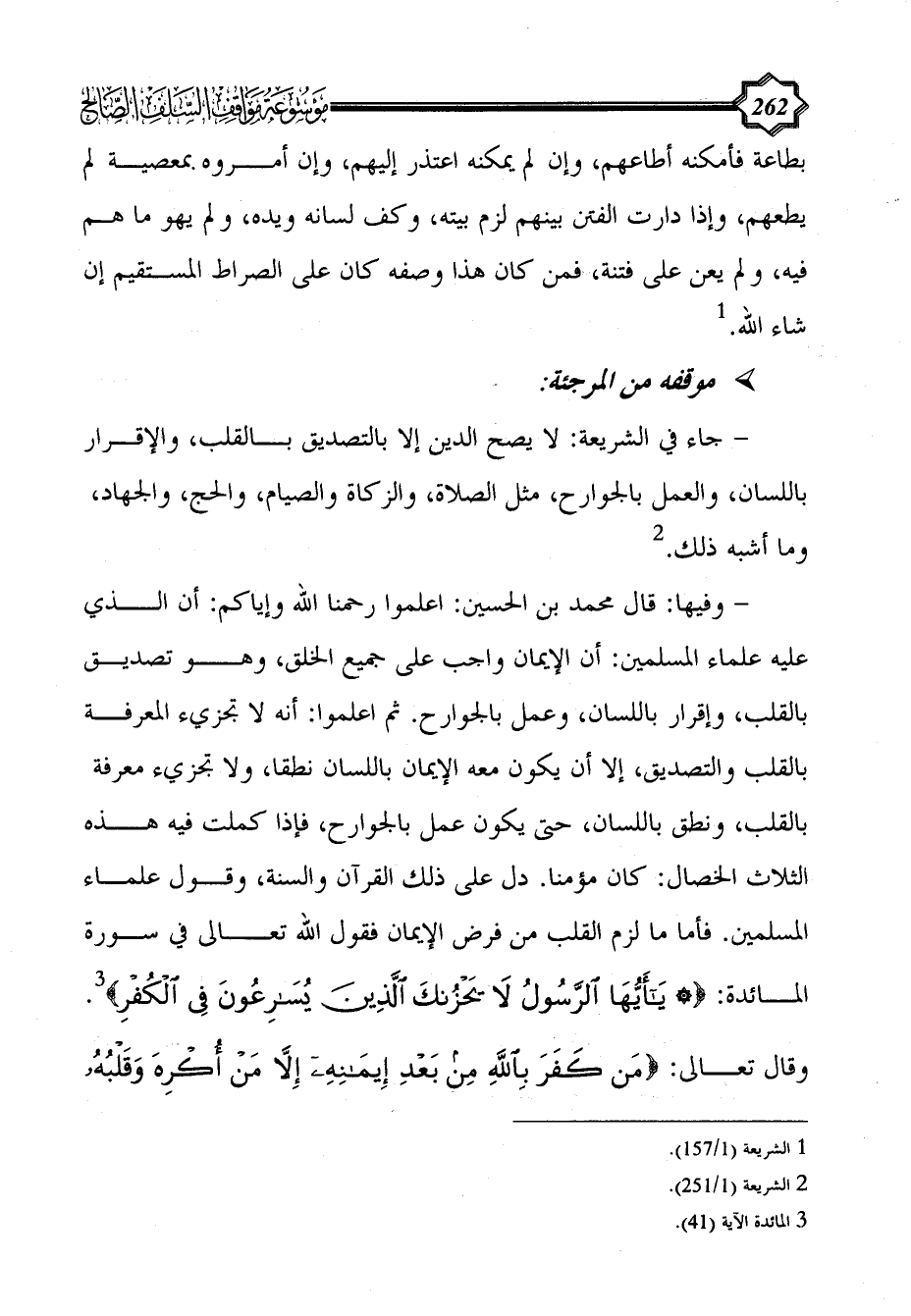 - وفيها: قال محمد بن الحسين: اعلموا رحمنا الله وإياكم: أن الذي عليه علماء المسلمين: أن الإيمان واجب على جميع الخلق، وهو تصديق بالقلب، وإقرار باللسان، وعمل بالجوارح. ثم اعلموا: أنه لا تجزيء المعرفة بالقلب والتصديق، إلا أن يكون معه الإيمان باللسان نطقاً، ولا تجزيء معرفة بالقلب، ونطق باللسان، حتى يكون عمل بالجوارح، فإذا كملت فيه هذه الثلاث الخصال: كان مؤمناً. دل على ذلك القرآن والسنة، وقول علماء المسلمين. فأما ما لزم القلب من فرض الإيمان فقول الله تعالى في سورة المائدة: {يَا أَيُّهَا الرَّسُولُ لَا يَحْزُنْكَ الَّذِينَ يُسَارِعُونَ فِي الْكُفْرِ} (¬3). وقال تعالى: {مَنْ كَفَرَ بِاللَّهِ مِنْ بَعْدِ إِيمَانِهِ إِلَّا مَنْ أُكْرِهَ وَقَلْبُهُ