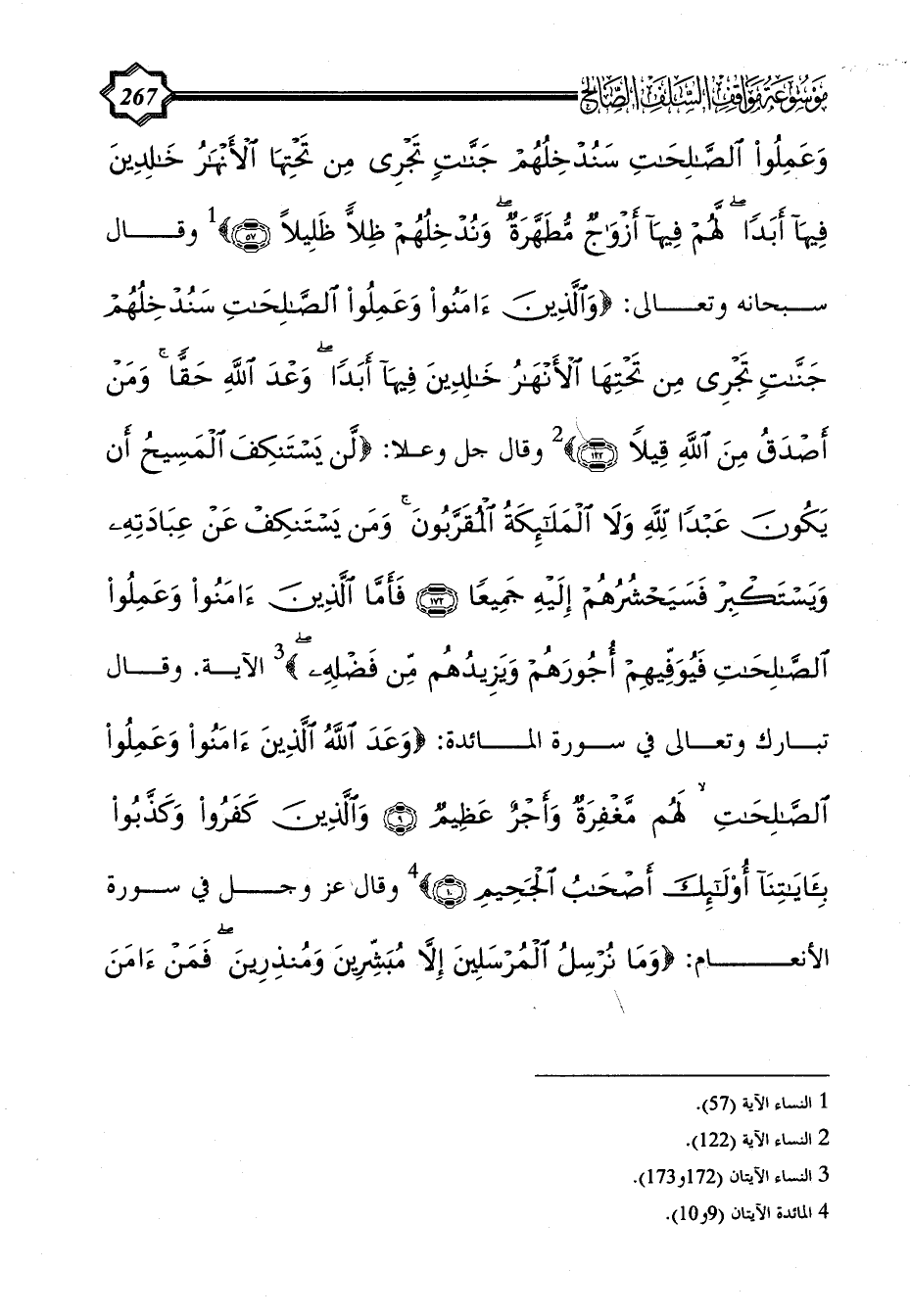 وَعَمِلُوا الصَّالِحَاتِ سَنُدْخِلُهُمْ جَنَّاتٍ تَجْرِي مِنْ تَحْتِهَا الْأَنْهَارُ خَالِدِينَ فِيهَا أَبَدًا لَهُمْ فِيهَا أَزْوَاجٌ مُطَهَّرَةٌ وَنُدْخِلُهُمْ ظِلًّا ظَلِيلًا (57)} (¬1) وقال سبحانه وتعالى: {وَالَّذِينَ آَمَنُوا وَعَمِلُوا الصَّالِحَاتِ سَنُدْخِلُهُمْ جَنَّاتٍ تَجْرِي مِنْ تَحْتِهَا الْأَنْهَارُ خَالِدِينَ فِيهَا أَبَدًا وَعْدَ اللَّهِ حَقًّا وَمَنْ أَصْدَقُ مِنَ اللَّهِ قِيلًا (122)} (¬2) وقال جل وعلا: {لَنْ يَسْتَنْكِفَ الْمَسِيحُ أَنْ يَكُونَ عَبْدًا لِلَّهِ وَلَا الْمَلَائِكَةُ الْمُقَرَّبُونَ وَمَنْ يَسْتَنْكِفْ عَنْ عِبَادَتِهِ وَيَسْتَكْبِرْ فَسَيَحْشُرُهُمْ إِلَيْهِ جَمِيعًا (172) فَأَمَّا الَّذِينَ آَمَنُوا وَعَمِلُوا الصَّالِحَاتِ فَيُوَفِّيهِمْ أُجُورَهُمْ وَيَزِيدُهُمْ مِنْ فَضْلِهِ} (¬3) الآية. وقال تبارك وتعالى في سورة المائدة: {وَعَدَ اللَّهُ الَّذِينَ آَمَنُوا وَعَمِلُوا الصَّالِحَاتِ لَهُمْ مَغْفِرَةٌ وَأَجْرٌ عَظِيمٌ (9) وَالَّذِينَ كَفَرُوا وَكَذَّبُوا بِآَيَاتِنَا أُولَئِكَ أَصْحَابُ الْجَحِيمِ (10)} (¬4) وقال عز وجل في سورة الأنعام: {وَمَا نُرْسِلُ الْمُرْسَلِينَ إِلَّا مُبَشِّرِينَ وَمُنْذِرِينَ فَمَنْ آَمَنَ