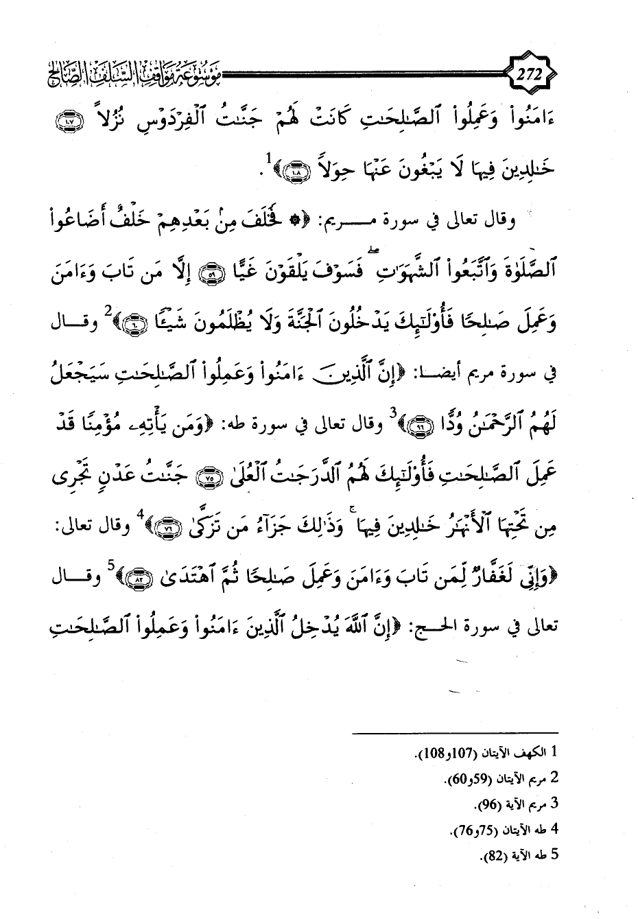 وقال تعالى في سورة مريم: {* فَخَلَفَ مِنْ بَعْدِهِمْ خَلْفٌ أَضَاعُوا الصَّلَاةَ وَاتَّبَعُوا الشَّهَوَاتِ فَسَوْفَ يَلْقَوْنَ غَيًّا (59) إِلَّا مَنْ تَابَ وَآَمَنَ وَعَمِلَ صَالِحًا فَأُولَئِكَ يَدْخُلُونَ الْجَنَّةَ وَلَا يُظْلَمُونَ شَيْئًا (60)} (¬2) وقال في سورة مريم أيضاً: {إِنَّ الَّذِينَ آَمَنُوا وَعَمِلُوا الصَّالِحَاتِ سَيَجْعَلُ لَهُمُ الرَّحْمَنُ وُدًّا (96)} (¬3) وقال تعالى في سورة طه: {وَمَنْ يَأْتِهِ مُؤْمِنًا قَدْ عَمِلَ الصَّالِحَاتِ فَأُولَئِكَ لَهُمُ الدَّرَجَاتُ الْعُلَا (75) جَنَّاتُ عَدْنٍ تَجْرِي مِنْ تَحْتِهَا الْأَنْهَارُ خَالِدِينَ فِيهَا وَذَلِكَ جَزَاءُ مَنْ تَزَكَّى (76)} (¬4) وقال تعالى: {وَإِنِّي لَغَفَّارٌ لِمَنْ تَابَ وَآَمَنَ وَعَمِلَ صَالِحًا ثُمَّ اهْتَدَى (82)} (¬5) وقال تعالى في سورة الحج: {إِنَّ اللَّهَ يُدْخِلُ الَّذِينَ آَمَنُوا وَعَمِلُوا الصَّالِحَاتِ