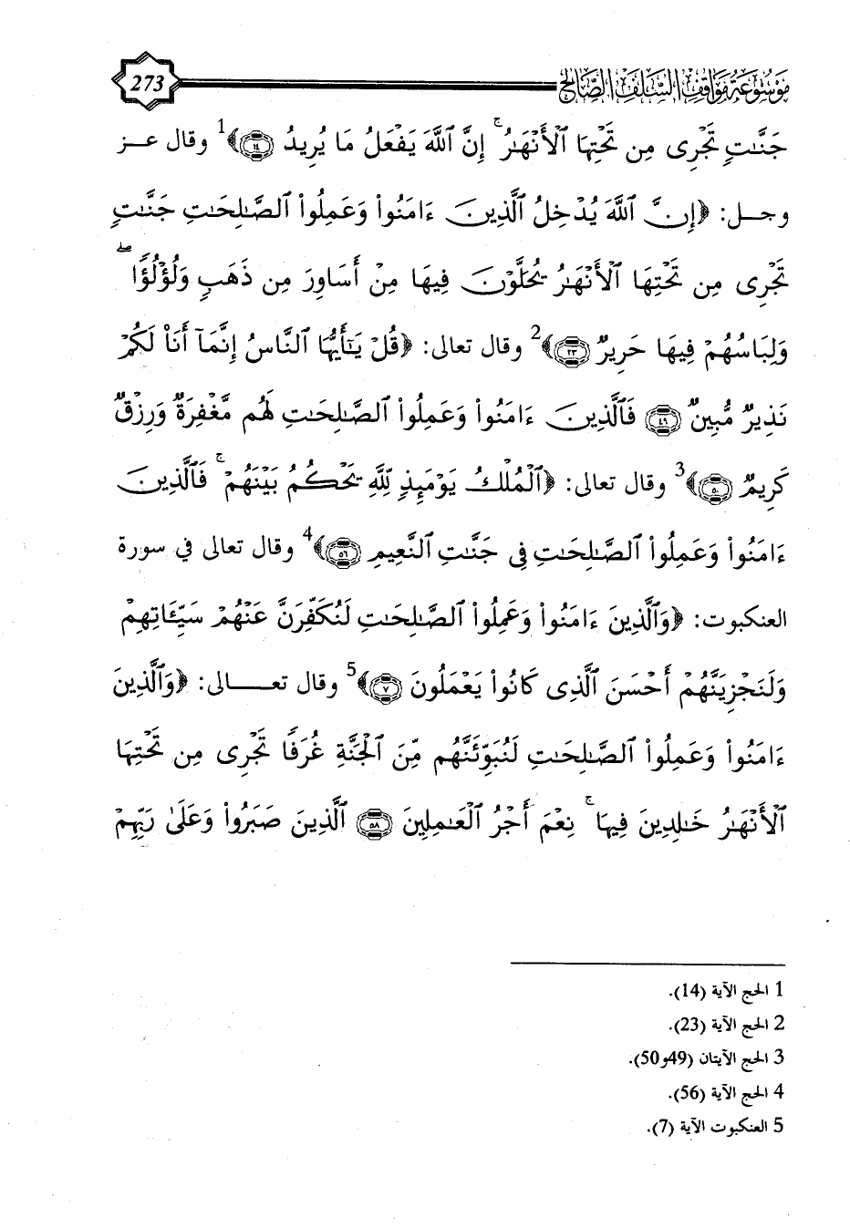 جَنَّاتٍ تَجْرِي مِنْ تَحْتِهَا الْأَنْهَارُ إِنَّ اللَّهَ يَفْعَلُ مَا يُرِيدُ (14)} (¬1) وقال عز وجل: {إِن اللَّهَ يُدْخِلُ الَّذِينَ آَمَنُوا وَعَمِلُوا الصَّالِحَاتِ جَنَّاتٍ تَجْرِي مِنْ تَحْتِهَا الْأَنْهَارُ يُحَلَّوْنَ فِيهَا مِنْ أَسَاوِرَ مِنْ ذَهَبٍ وَلُؤْلُؤًا وَلِبَاسُهُمْ فِيهَا حَرِيرٌ (23)} (¬2) وقال تعالى: {قُلْ يَا أَيُّهَا النَّاسُ إِنَّمَا أَنَا لَكُمْ نَذِيرٌ مُبِينٌ (49) فَالَّذِينَ آَمَنُوا وَعَمِلُوا الصَّالِحَاتِ لَهُمْ مَغْفِرَةٌ وَرِزْقٌ كَرِيمٌ (50)} (¬3) وقال تعالى: {الْمُلْكُ يَوْمَئِذٍ لِلَّهِ يَحْكُمُ بَيْنَهُمْ فَالَّذِينَ آَمَنُوا وَعَمِلُوا الصَّالِحَاتِ فِي جَنَّاتِ النَّعِيمِ (56)} (¬4)