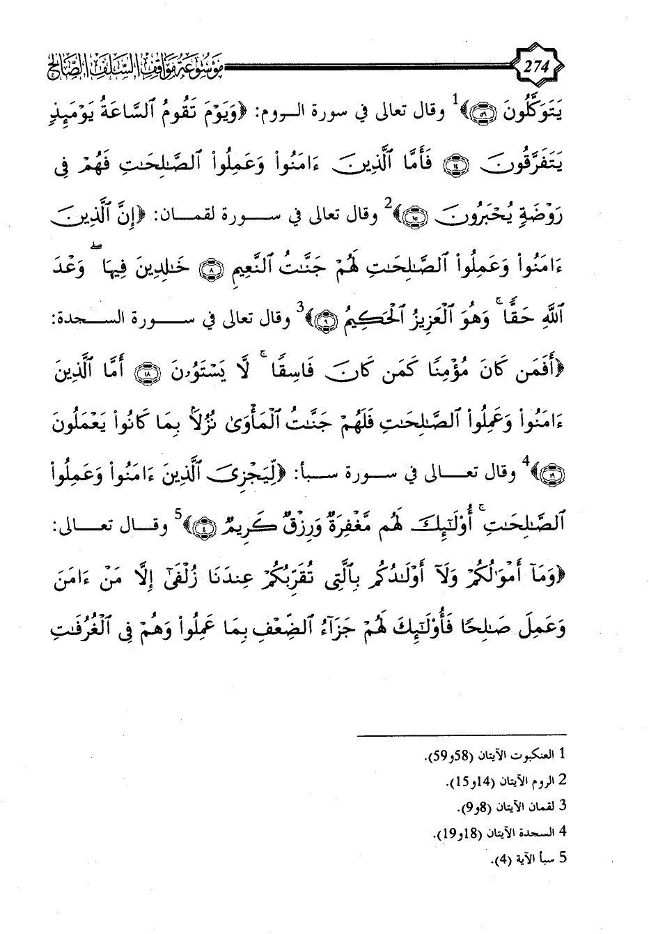 يَتَوَكَّلُونَ (59)} (¬1) وقال تعالى في سورة الروم: {وَيَوْمَ تَقُومُ السَّاعَةُ يَوْمَئِذٍ يَتَفَرَّقُونَ (14) فَأَمَّا الَّذِينَ آَمَنُوا وَعَمِلُوا الصَّالِحَاتِ فَهُمْ فِي رَوْضَةٍ يُحْبَرُونَ (15)} (¬2) وقال تعالى في سورة لقمان: {إِنَّ الَّذِينَ آَمَنُوا وَعَمِلُوا الصَّالِحَاتِ لَهُمْ جَنَّاتُ النَّعِيمِ (8) خَالِدِينَ فِيهَا وَعْدَ اللَّهِ حَقًّا وَهُوَ الْعَزِيزُ الْحَكِيمُ (9)} (¬3) وقال تعالى في سورة السجدة: {أَفَمَنْ كَانَ مُؤْمِنًا كَمَنْ كَانَ فَاسِقًا لَا يَسْتَوُونَ (18) أَمَّا الَّذِينَ آَمَنُوا وَعَمِلُوا الصَّالِحَاتِ فَلَهُمْ جَنَّاتُ الْمَأْوَى نُزُلًا بِمَا كَانُوا يَعْمَلُونَ (19)} (¬4) وقال تعالى في سورة سبأ: {لِيَجْزِيَ الَّذِينَ آَمَنُوا وَعَمِلُوا الصَّالِحَاتِ أُولَئِكَ لَهُمْ مَغْفِرَةٌ وَرِزْقٌ كَرِيمٌ (4)} (¬5) وقال تعالى: {وَمَا أَمْوَالُكُمْ وَلَا أَوْلَادُكُمْ بِالَّتِي تُقَرِّبُكُمْ عِنْدَنَا زُلْفَى إِلَّا مَنْ آَمَنَ وَعَمِلَ صَالِحًا فَأُولَئِكَ لَهُمْ جَزَاءُ الضِّعْفِ بِمَا عَمِلُوا وَهُمْ فِي الْغُرُفَاتِ