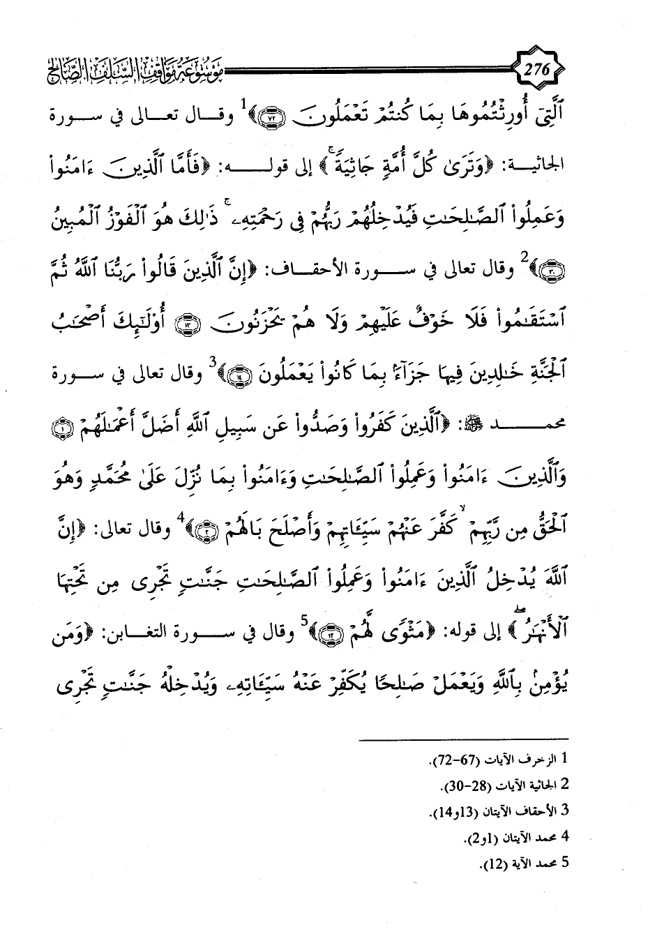 وقال تعالى في سورة الأحقاف: {إِنَّ الَّذِينَ قَالُوا رَبُّنَا اللَّهُ ثُمَّ اسْتَقَامُوا فَلَا خَوْفٌ عَلَيْهِمْ وَلَا هُمْ يَحْزَنُونَ (13) أُولَئِكَ أَصْحَابُ الْجَنَّةِ خَالِدِينَ فِيهَا جَزَاءً بِمَا كَانُوا يَعْمَلُونَ (14)} (¬3) وقال تعالى في سورة محمد - صلى الله عليه وسلم -: {الَّذِينَ كَفَرُوا وَصَدُّوا عَنْ سَبِيلِ اللَّهِ أَضَلَّ أَعْمَالَهُمْ (1) وَالَّذِينَ آَمَنُوا وَعَمِلُوا الصَّالِحَاتِ وَآَمَنُوا بِمَا نُزِّلَ عَلَى مُحَمَّدٍ وَهُوَ الْحَقُّ مِنْ رَبِّهِمْ كَفَّرَ عَنْهُمْ سَيِّئَاتِهِمْ وَأَصْلَحَ بَالَهُمْ (2)} (¬4) وقال تعالى: {إِنَّ اللَّهَ يُدْخِلُ الَّذِينَ آَمَنُوا وَعَمِلُوا الصَّالِحَاتِ جَنَّاتٍ تَجْرِي مِنْ تَحْتِهَا الْأَنْهَارُ} إلى قوله: {مَثْوًى لَهُمْ (12)} (¬5) وقال في سورة التغابن: {وَمَنْ يُؤْمِنْ بِاللَّهِ وَيَعْمَلْ صَالِحًا يُكَفِّرْ عَنْهُ سَيِّئَاتِهِ وَيُدْخِلْهُ جَنَّاتٍ تَجْرِي