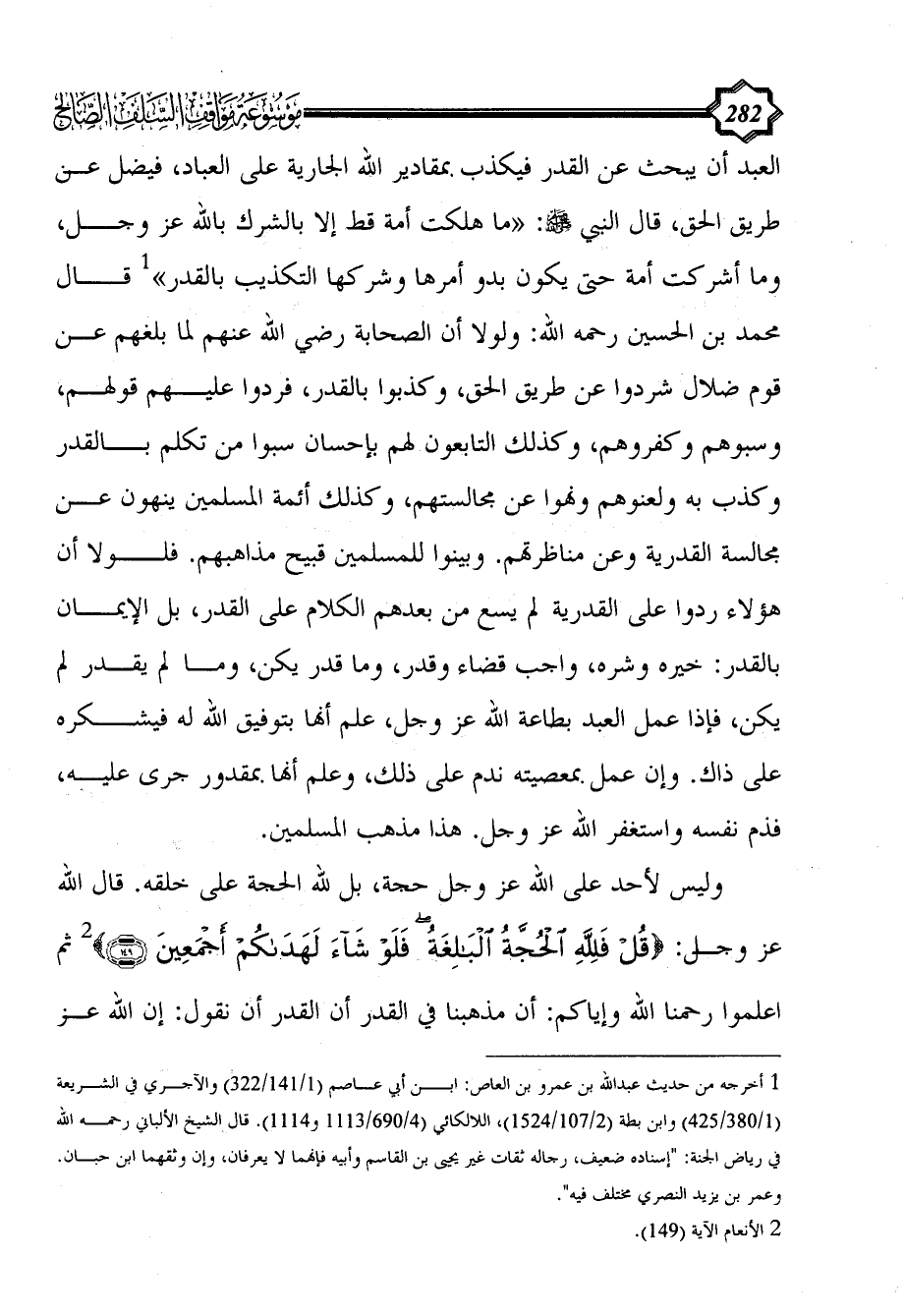 وليس لأحد على الله عز وجل حجة، بل لله الحجة على خلقه. قال الله عز وجل: {قُلْ فَلِلَّهِ الْحُجَّةُ الْبَالِغَةُ فَلَوْ شَاءَ لَهَدَاكُمْ أَجْمَعِينَ (149)} (¬2) ثم اعلموا رحمنا الله وإياكم: أن مذهبنا في القدر أن القدر أن نقول: إن الله عز