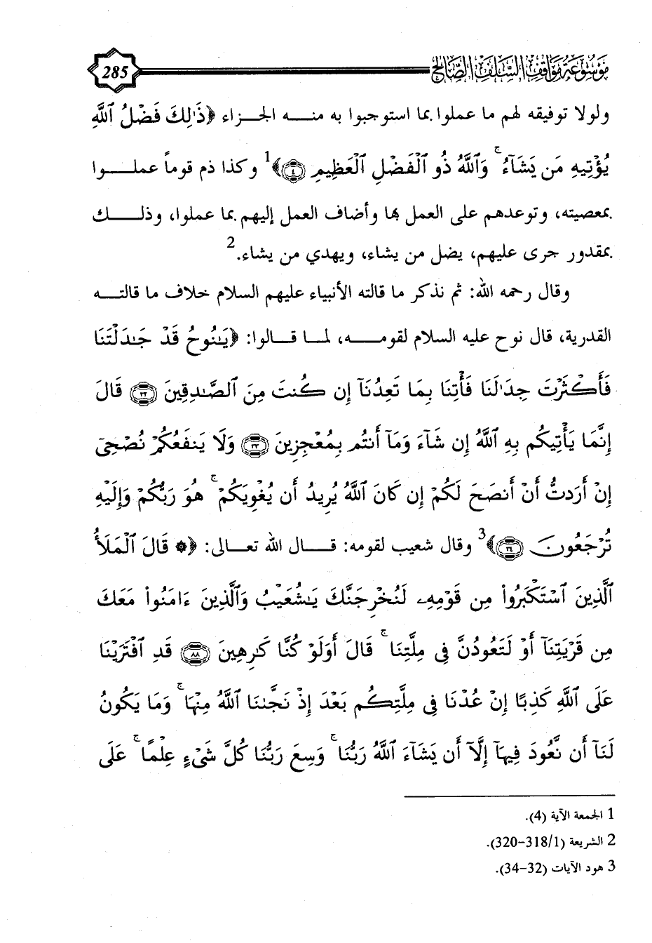 وقال رحمه الله: ثم نذكر ما قالته الأنبياء عليهم السلام خلاف ما قالته القدرية، قال نوح عليه السلام لقومه، لما قالوا: {يَا نُوحُ قَدْ جَادَلْتَنَا فَأَكْثَرْتَ جِدَالَنَا فَأْتِنَا بِمَا تَعِدُنَا إِنْ كُنْتَ مِنَ الصَّادِقِينَ (32) قَالَ إِنَّمَا يَأْتِيكُمْ بِهِ اللَّهُ إِنْ شَاءَ وَمَا أَنْتُمْ بِمُعْجِزِينَ (33) وَلَا يَنْفَعُكُمْ نُصْحِي إِنْ أَرَدْتُ أَنْ أَنْصَحَ لَكُمْ إِنْ كَانَ اللَّهُ يُرِيدُ أَنْ يُغْوِيَكُمْ هُوَ رَبُّكُمْ وَإِلَيْهِ تُرْجَعُونَ (34)} (¬3) وقال شعيب لقومه: قال الله تعالى: {* قَالَ الْمَلَأُ الَّذِينَ اسْتَكْبَرُوا مِنْ قَوْمِهِ لَنُخْرِجَنَّكَ يَا شُعَيْبُ وَالَّذِينَ آَمَنُوا مَعَكَ مِنْ قَرْيَتِنَا أَوْ لَتَعُودُنَّ فِي مِلَّتِنَا قَالَ أَوَلَوْ كُنَّا كَارِهِينَ (88) قَدِ افْتَرَيْنَا عَلَى اللَّهِ كَذِبًا إِنْ عُدْنَا فِي مِلَّتِكُمْ بَعْدَ إِذْ نَجَّانَا اللَّهُ مِنْهَا وَمَا يَكُونُ لَنَا أَنْ نَعُودَ فِيهَا إِلَّا أَنْ يَشَاءَ اللَّهُ رَبُّنَا وَسِعَ رَبُّنَا كُلَّ شَيْءٍ عِلْمًا عَلَى
