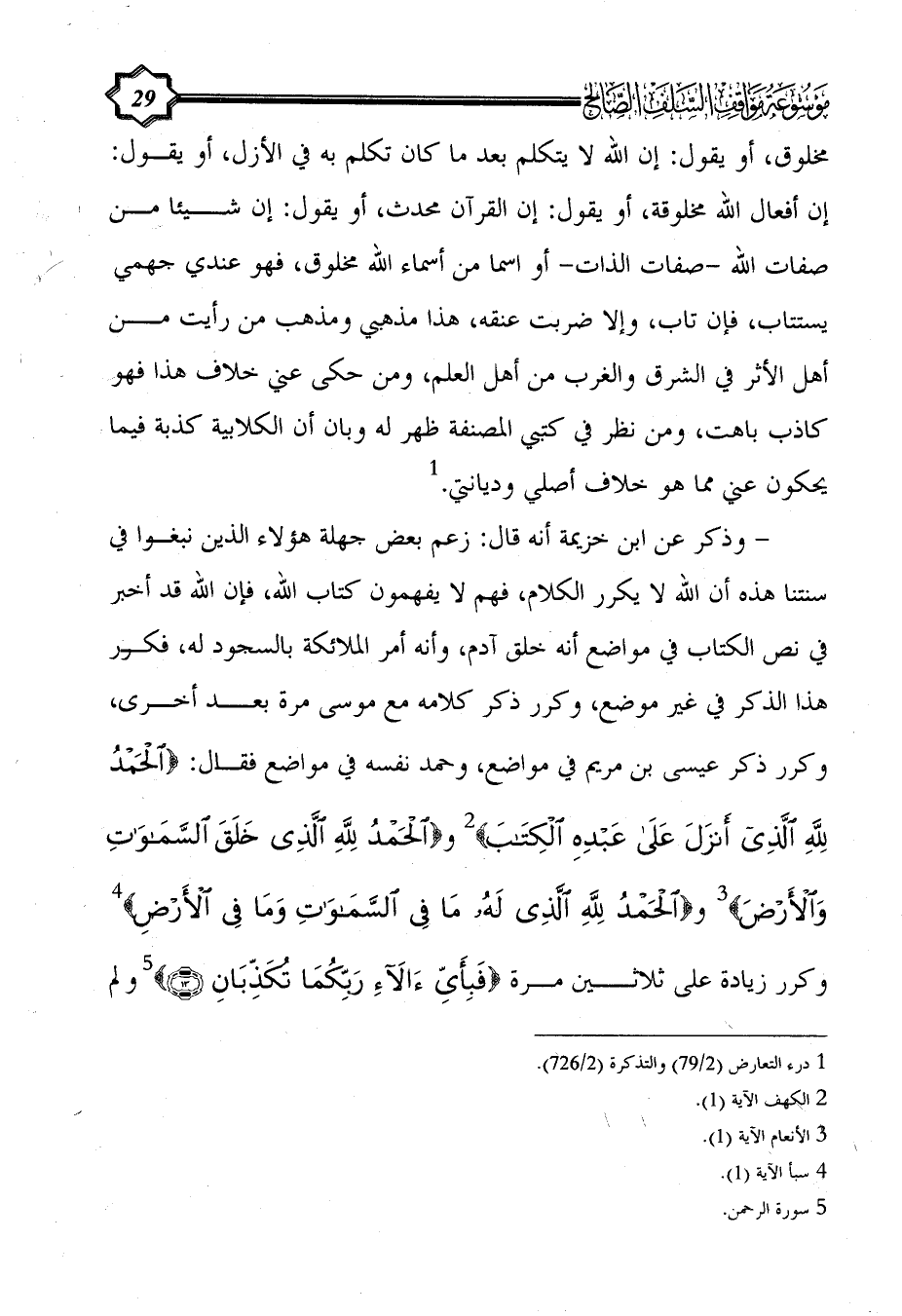 - وذكر عن ابن خزيمة أنه قال: زعم بعض جهلة هؤلاء الذين نبغوا في سنتنا هذه أن الله لا يكرر الكلام، فهم لا يفهمون كتاب الله، فإن الله قد أخبر في نص الكتاب في مواضع أنه خلق آدم، وأنه أمر الملائكة بالسجود له، فكرر هذا الذكر في غير موضع، وكرر ذكر كلامه مع موسى مرة بعد أخرى، وكرر ذكر عيسى بن مريم في مواضع، وحمد نفسه في مواضع فقال: {الْحَمْدُ لِلَّهِ الَّذِي أَنْزَلَ عَلَى عَبْدِهِ الْكِتَابَ} (¬2) و {الْحَمْدُ لِلَّهِ الَّذِي خَلَقَ السَّمَاوَاتِ وَالْأَرْضَ} (¬3) {الْحَمْدُ لِلَّهِ الَّذِي لَهُ مَا فِي السَّمَاوَاتِ وَمَا فِي الْأَرْضِ} (¬4) وكرر زيادة على ثلاثين مرة {فَبِأَيِّ آلَاءِ رَبِّكُمَا تُكَذِّبَانِ} (¬5) ولم