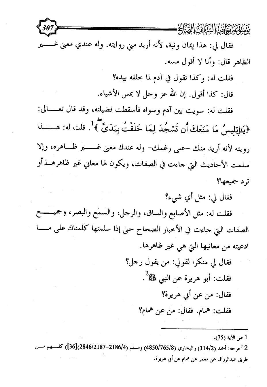 فقلت له: سويت بين آدم وسواه فأسقطت فضيلته، وقد قال تعالى: {يَا إِبْلِيسُ مَا مَنَعَكَ أَنْ تَسْجُدَ لِمَا خَلَقْتُ بِيَدَيَّ} (¬1). قلت له: هذا رويته لأنه أريد منك -على رغمك- وله عندك معنى غير ظاهره، وإلا سلمت الأحاديث التي جاءت في الصفات، ويكون لها معاني غير ظاهرها أو ترد جميعها؟