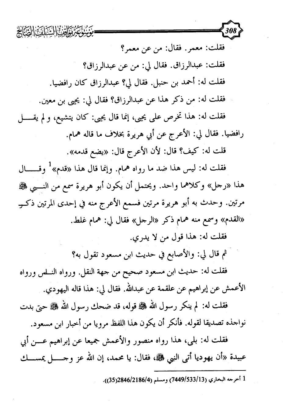 فقلت له: هذا تخرص على يحيى، إنما قال يحيى: كان يتشيع، ولم يقل رافضياً. فقال لي: الأعرج عن أبي هريرة بخلاف ما قاله همام.