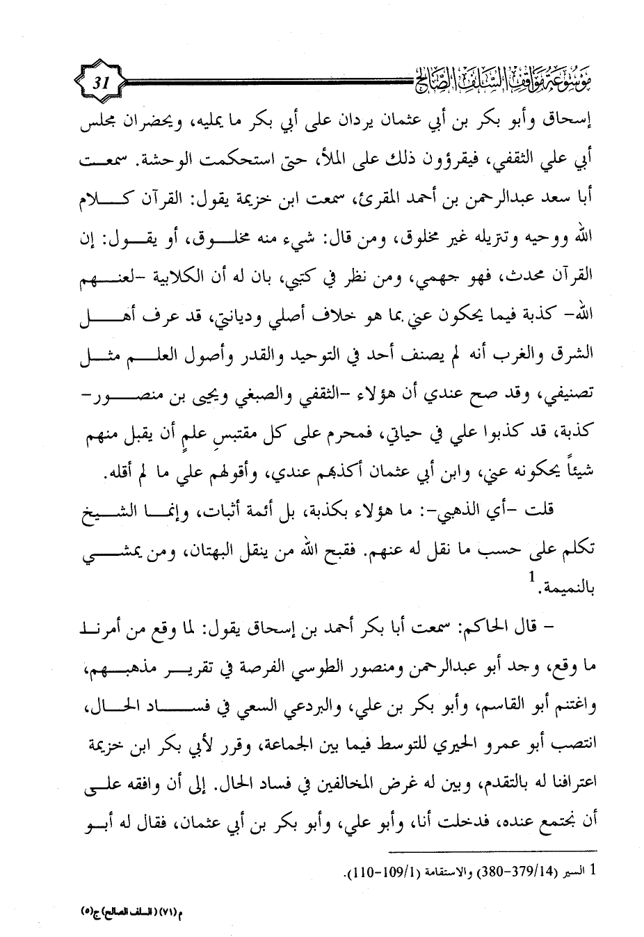 إسحاق وأبو بكر بن أبي عثمان يردان على أبي بكر ما يمليه، ويحضران مجلس أبي علي الثقفي، فيقرؤون ذلك على الملأ، حتى استحكمت الوحشة. سمعت أبا سعد عبد الرحمن بن أحمد المقرئ، سمعت ابن خزيمة يقول: القرآن كلام الله ووحيه وتنزيله غير مخلوق، ومن قال: شيء منه مخلوق، أو يقول: إن القرآن محدث، فهو جهمي، ومن نظر في كتبي، بان له أن الكلابية -لعنهم الله- كذبة فيما يحكون عني بما هو خلاف أصلي وديانتي، قد عرف أهل الشرق والغرب أنه لم يصنف أحد في التوحيد والقدر وأصول العلم مثل تصنيفي، وقد صح عندي أن هؤلاء -الثقفي والصبغي ويحيى بن منصور- كذبة، قد كذبوا علي في حياتي، فمحرم على كل مقتبسِ علمٍ أن يقبل منهم شيئاً يحكونه عني، وابن أبي عثمان أكذبهم عندي، وأقولهم علي ما لم أقله.