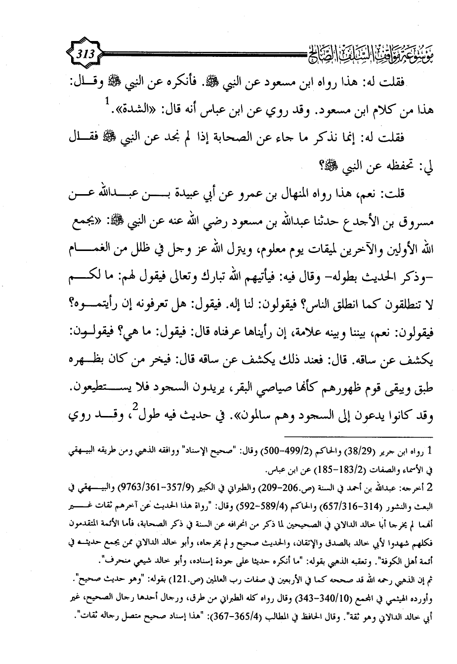 قلت: نعم، هذا رواه المنهال بن عمرو عن أبي عبيدة بن عبد الله عن مسروق بن الأجدع حدثنا عبد الله بن مسعود رضي الله عنه عن النبي - صلى الله عليه وسلم -: «يجمع الله الأولين والآخرين لميقات يوم معلوم، وينزل الله عز وجل في ظلل من الغمام -وذكر الحديث بطوله- وقال فيه: فيأتيهم الله تبارك وتعالى فيقول لهم: ما لكم لا تنطلقون كما انطلق الناس؟ فيقولون: لنا إله. فيقول: هل تعرفونه إن رأيتموه؟ فيقولون: نعم، بيننا وبينه علامة، إن رأيناها عرفناه قال: فيقول: ما هي؟ فيقولون: يكشف عن ساقه. قال: فعند ذلك يكشف عن ساقه قال: فيخر من كان بظهره طبق ويبقى قوم ظهورهم كأنها صياصي البقر، يريدون السجود فلا يستطيعون. وقد كانوا يدعون إلى السجود وهم سالمون». في حديث فيه طول (¬2)،