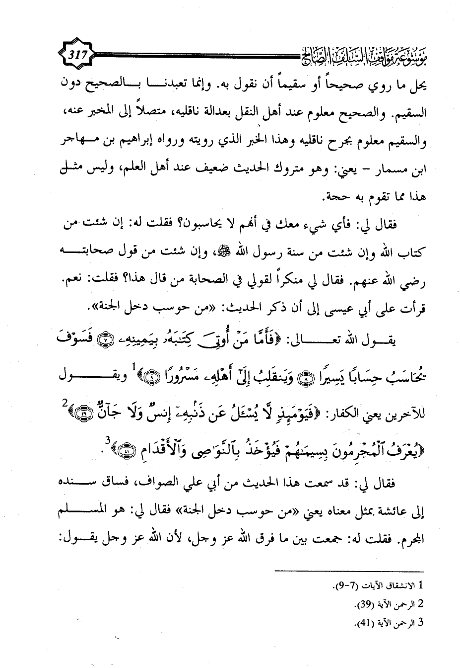 فقال لي: قد سمعت هذا الحديث من أبي علي الصواف، فساق سنده إلى عائشة بمثل معناه يعني «من حوسب دخل الجنة» فقال لي: هو المسلم المجرم. فقلت له: جمعت بين ما فرق الله عز وجل، لأن الله عز وجل يقول: