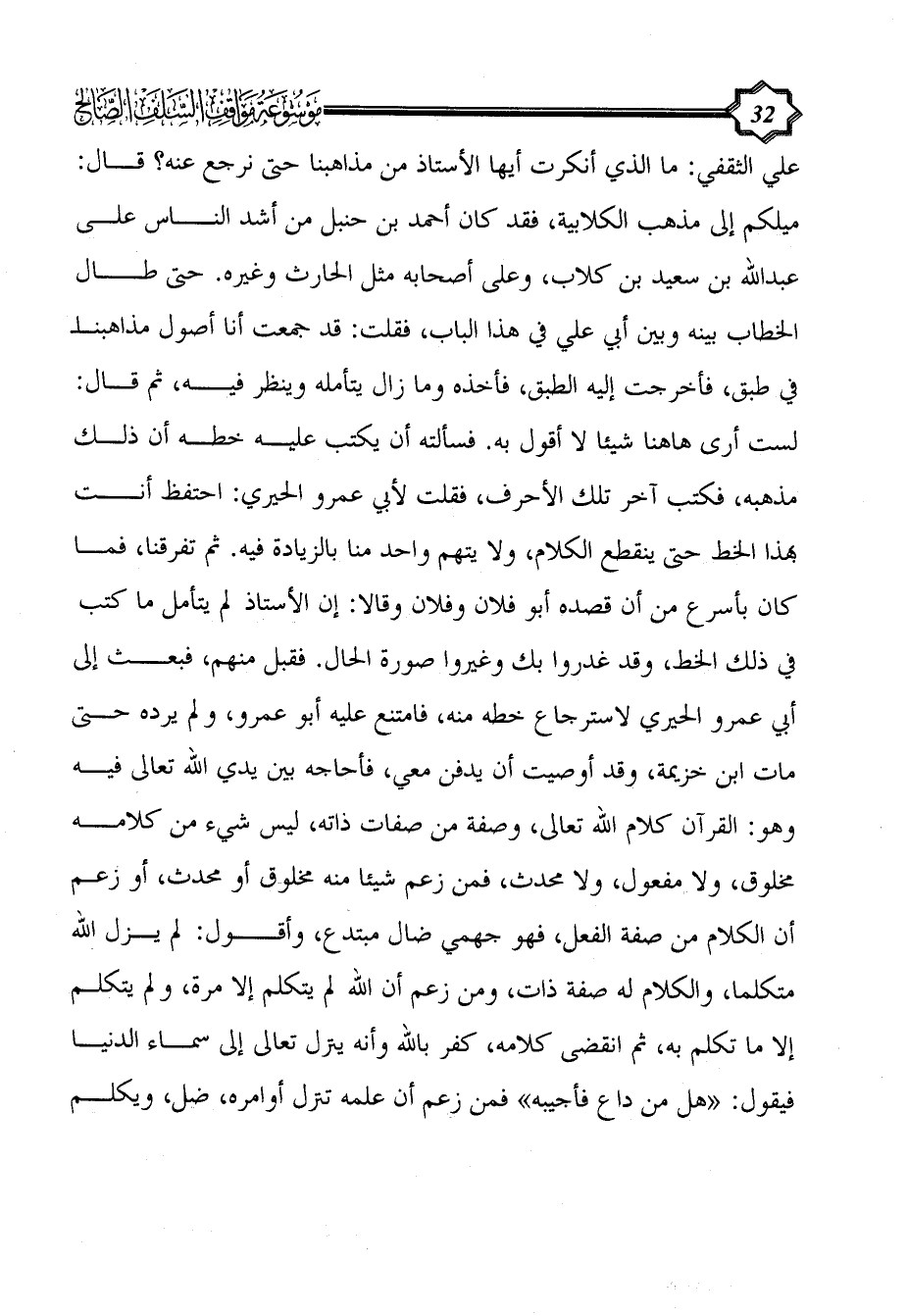 فقبل منهم، فبعث إلى أبي عمرو الحيري لاسترجاع خطه منه، فامتنع عليه أبو عمرو، ولم يرده حتى مات ابن خزيمة، وقد أوصيت أن يدفن معي، فأحاجه بين يدي الله تعالى فيه وهو: القرآن كلام الله تعالى، وصفة من صفات ذاته، ليس شيء من كلامه مخلوق، ولا مفعول، ولا محدث، فمن زعم شيئاً منه مخلوق أو محدث، أو زعم أن الكلام من صفة الفعل، فهو جهمي ضال مبتدع، وأقول: لم يزل الله متكلماً، والكلام له صفة ذات، ومن زعم أن الله لم يتكلم إلا مرة، ولم يتكلم إلا ما تكلم به، ثم انقضى كلامه، كفر بالله وأنه ينزل تعالى إلى سماء الدنيا فيقول: "هل من داع فأجيبه" فمن زعم أن علمه تنزل أوامره، ضل، ويكلم
