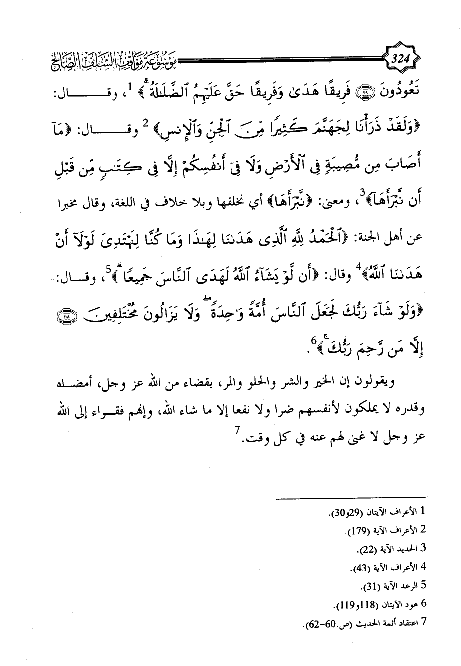 تَعُودُونَ (29) فَرِيقًا هَدَى وَفَرِيقًا حَقَّ عَلَيْهِمُ الضَّلَالَةُ} (¬1)، وقال: {وَلَقَدْ ذَرَأْنَا لِجَهَنَّمَ كَثِيرًا مِنَ الْجِنِّ وَالْإِنْسِ} (¬2) وقال: {مَا أَصَابَ مِنْ مُصِيبَةٍ فِي الْأَرْضِ وَلَا فِي أَنْفُسِكُمْ إِلَّا فِي كِتَابٍ مِنْ قَبْلِ أَنْ نَبْرَأَهَا} (¬3)، ومعنى: {نبرأها} أي نخلقها وبلا خلاف في اللغة، وقال مخبراً عن أهل الجنة: {الْحَمْدُ لِلَّهِ الَّذِي هَدَانَا لِهَذَا وَمَا كُنَّا لِنَهْتَدِيَ لَوْلَا أَنْ هَدَانَا اللَّهُ} (¬4) وقال: {أَنْ لَوْ يَشَاءُ اللَّهُ لَهَدَى النَّاسَ جَمِيعًا} (¬5)، وقال: {وَلَوْ شَاءَ رَبُّكَ لَجَعَلَ النَّاسَ أُمَّةً وَاحِدَةً وَلَا يَزَالُونَ مُخْتَلِفِينَ (118) إِلَّا مَنْ رَحِمَ رَبُّكَ} (¬6).