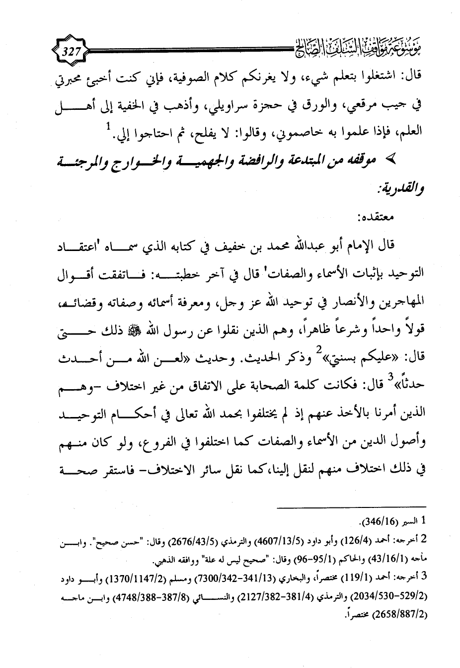 قال الإمام أبو عبد الله محمد بن خفيف في كتابه الذي سماه 'اعتقاد التوحيد بإثبات الأسماء والصفات' قال في آخر خطبته: فاتفقت أقوال المهاجرين والأنصار في توحيد الله عز وجل، ومعرفة أسمائه وصفاته وقضائه، قولاً واحداً وشرعاً ظاهراً، وهم الذين نقلوا عن رسول الله - صلى الله عليه وسلم - ذلك حتى قال: «عليكم بسنتي» (¬2) وذكر الحديث. وحديث «لعن الله من أحدث حدثاً» (¬3) قال: فكانت كلمة الصحابة على الاتفاق من غير اختلاف -وهم الذين أمرنا بالأخذ عنهم إذ لم يختلفوا بحمد الله تعالى في أحكام التوحيد وأصول الدين من الأسماء والصفات كما اختلفوا في الفروع، ولو كان منهم في ذلك اختلاف منهم لنقل إلينا، كما نقل سائر الاختلاف- فاستقر صحة