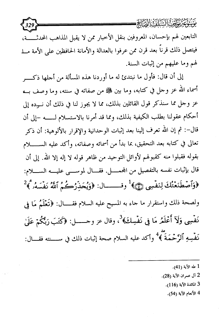 إلى أن قال: فأول ما نبتدئ له ما أوردنا هذه المسألة من أجلها ذكر أسماء الله عز وجل في كتابه، وما بين - صلى الله عليه وسلم - من صفاته في سنته، وما وصف به عز وجل مما سنذكر قول القائلين بذلك، مما لا يجوز لنا في ذلك أن نرده إلى أحكام عقولنا بطلب الكيفية بذلك، ومما قد أمرنا بالاستسلام له -إلى أن قال-: ثم إن الله تعرف إلينا بعد إثبات الوحدانية والإقرار بالألوهية: أن ذكر تعالى في كتابه بعد التحقيق، بما بدأ من أسمائه وصفاته، وأكد عليه السلام بقوله فقبلوا منه كقبولهم لأوائل التوحيد من ظاهر قوله لا إله إلا الله. إلى أن قال بإثبات نفسه بالتفصيل من المجمل. فقال لموسى عليه السلام: {وَاصْطَنَعْتُكَ لِنَفْسِي (41)} (¬1) وقال: {وَيُحَذِّرُكُمُ اللَّهُ نَفْسَهُ} (¬2) ولصحة ذلك واستقرار ما جاء به المسيح عليه السلام فقال: {تَعْلَمُ مَا فِي نَفْسِي وَلَا أَعْلَمُ مَا فِي نَفْسِكَ} (¬3)، وقال عز وجل: {كَتَبَ رَبُّكُمْ عَلَى نَفْسِهِ الرَّحْمَةَ} (¬4) وأكد عليه السلام صحة إثبات ذلك في سنته فقال: