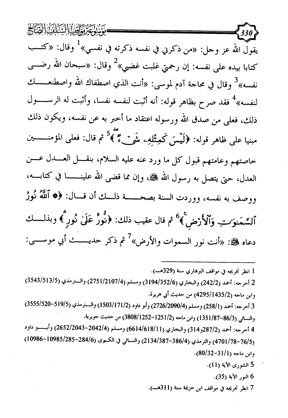 وقال في محاجة آدم لموسى: «أنت الذي اصطفاك الله واصطنعك لنفسه» (¬4) فقد صرح بظاهر قوله: أنه أثبت لنفسه نفساً، وأثبت له الرسول ذلك، فعلى من صدق الله ورسوله اعتقاد ما أخبر به عن نفسه، ويكون ذلك مبنياً على ظاهر قوله: {لَيْسَ كَمِثْلِهِ شَيْءٌ} (¬5) ثم قال: فعلى المؤمنين خاصتهم وعامتهم قبول كل ما ورد عنه عليه السلام، بنقل العدل عن العدل، حتى يتصل به رسول الله - صلى الله عليه وسلم -، وإن مما قضى الله علينا في كتابه، ووصف به نفسه، ووردت السنة بصحة ذلك أن قال: {* اللَّهُ نُورُ السَّمَاوَاتِ وَالْأَرْضِ} (¬6) ثم قال عقيب ذلك: {نُورٌ عَلَى نُورٍ} وبذلك دعاه - صلى الله عليه وسلم -: «أنت نور السموات والأرض» (¬7) ثم ذكر حديث أبي موسى: