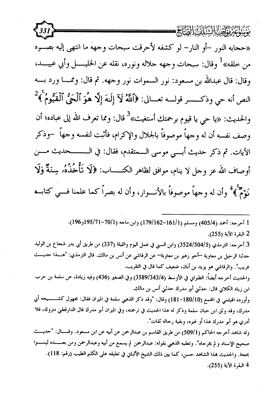 «حجابه النور -أو النار- لو كشفه لأحرقت سبحات وجهه ما انتهى إليه بصره من خلقه» (¬1) وقال: سبحات وجهه جلاله ونوره، نقله عن الخليل وأبي عبيد، وقال: قال عبد الله بن مسعود: نور السموات نور وجهه. ثم قال: ومما ورد به النص أنه حي وذكر قوله تعالى: {اللَّهُ لَا إِلَهَ إِلَّا هُوَ الْحَيُّ الْقَيُّومُ} (¬2) والحديث: «يا حي يا قيوم برحمتك أستغيث» (¬3)