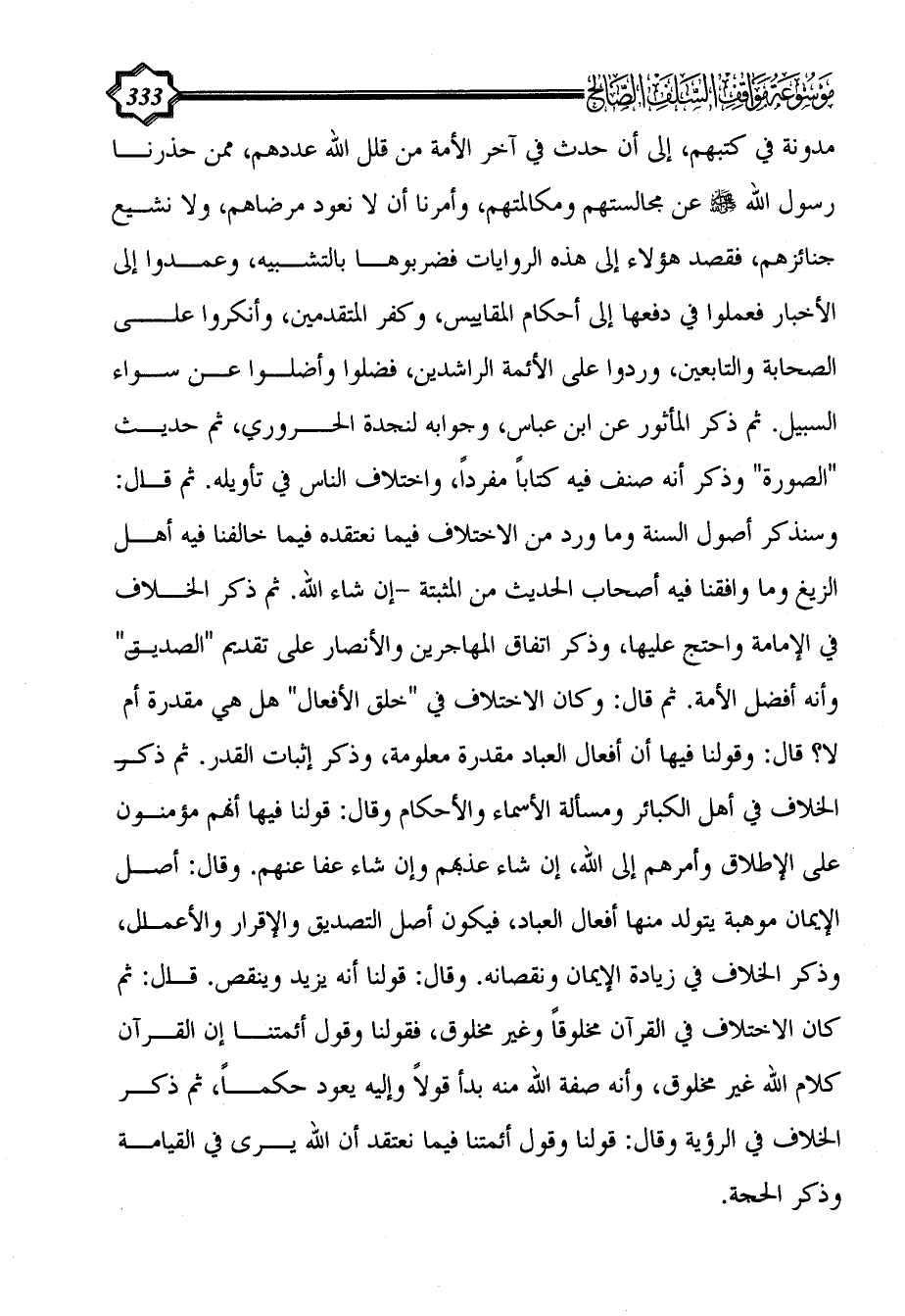 مدونة في كتبهم، إلى أن حدث في آخر الأمة من قلل الله عددهم، ممن حذرنا رسول الله - صلى الله عليه وسلم - عن مجالستهم ومكالمتهم، وأمرنا أن لا نعود مرضاهم، ولا نشيع جنائزهم، فقصد هؤلاء إلى هذه الروايات فضربوها بالتشبيه، وعمدوا إلى الأخبار فعملوا في دفعها إلى أحكام المقاييس، وكفر المتقدمين، وأنكروا على الصحابة والتابعين، وردوا على الأئمة الراشدين، فضلوا وأضلوا عن سواء السبيل. ثم ذكر المأثور عن ابن عباس، وجوابه لنجدة الحروري، ثم حديث "الصورة" وذكر أنه صنف فيه كتاباً مفرداً، واختلاف الناس في تأويله. ثم قال: وسنذكر أصول السنة وما ورد من الاختلاف فيما نعتقده فيما خالفنا فيه أهل الزيغ وما وافقنا فيه أصحاب الحديث من المثبتة -إن شاء الله. ثم ذكر الخلاف في الإمامة واحتج عليها، وذكر اتفاق المهاجرين والأنصار على تقديم "الصديق" وأنه أفضل الأمة. ثم قال: وكان الاختلاف في "خلق الأفعال" هل هي مقدرة أم لا؟ قال: وقولنا فيها أن أفعال العباد مقدرة معلومة، وذكر إثبات القدر. ثم ذكر الخلاف في أهل الكبائر ومسألة الأسماء والأحكام وقال: قولنا فيها أنهم مؤمنون على الإطلاق وأمرهم إلى الله، إن شاء عذبهم وإن شاء عفا عنهم. وقال: أصل الإيمان موهبة يتولد منها أفعال العباد، فيكون أصل التصديق والإقرار والأعمال، وذكر الخلاف في زيادة الإيمان ونقصانه. وقال: قولنا أنه يزيد وينقص.