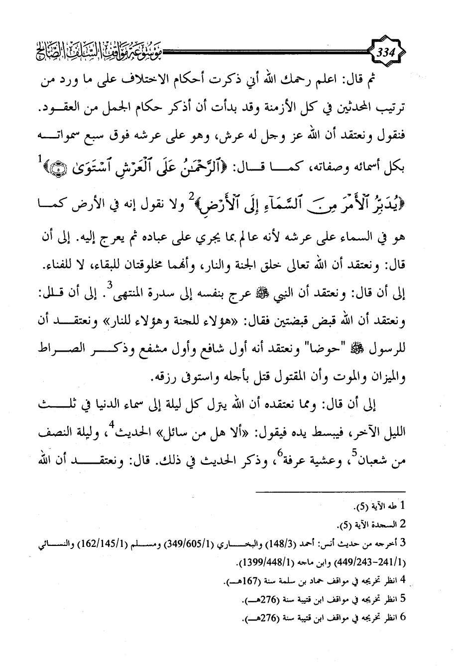 ثم قال: اعلم رحمك الله أني ذكرت أحكام الاختلاف على ما ورد من ترتيب المحدثين في كل الأزمنة وقد بدأت أن أذكر حكام الجمل من العقود. فنقول ونعتقد أن الله عز وجل له عرش، وهو على عرشه فوق سبع سمواته بكل أسمائه وصفاته، كما قال: {الرَّحْمَنُ عَلَى الْعَرْشِ اسْتَوَى (5)} (¬1) {يُدَبِّرُ الْأَمْرَ مِنَ السَّمَاءِ إِلَى الْأَرْضِ} (¬2) ولا نقول إنه في الأرض كما هو في السماء على عرشه لأنه عالم بما يجري على عباده ثم يعرج إليه. إلى أن قال: ونعتقد أن الله تعالى خلق الجنة والنار، وأنهما مخلوقتان للبقاء، لا للفناء. إلى أن قال: ونعتقد أن النبي - صلى الله عليه وسلم - عرج بنفسه إلى سدرة المنتهى (¬3). إلى أن قال: ونعتقد أن الله قبض قبضتين فقال: «هؤلاء للجنة وهؤلاء للنار» ونعتقد أن للرسول - صلى الله عليه وسلم - "حوضاً" ونعتقد أنه أول شافع وأول مشفع وذكر الصراط والميزان والموت وأن المقتول قتل بأجله واستوفى رزقه.