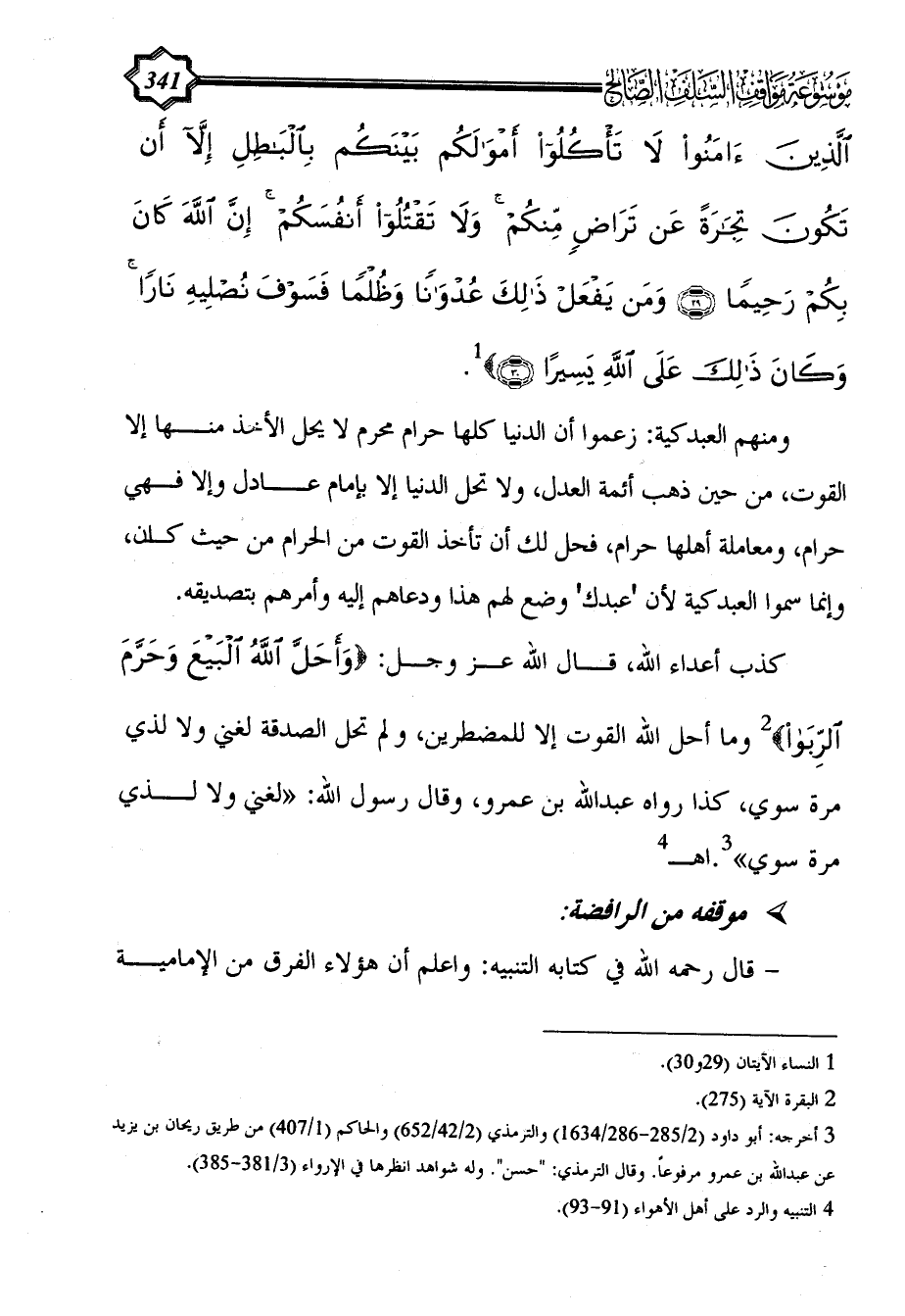 الَّذِينَ آَمَنُوا لَا تَأْكُلُوا أَمْوَالَكُمْ بَيْنَكُمْ بِالْبَاطِلِ إِلَّا أَنْ تَكُونَ تِجَارَةً عَنْ تَرَاضٍ مِنْكُمْ وَلَا تَقْتُلُوا أَنْفُسَكُمْ إِنَّ اللَّهَ كَانَ بِكُمْ رَحِيمًا (29) وَمَنْ يَفْعَلْ ذَلِكَ عُدْوَانًا وَظُلْمًا فَسَوْفَ نُصْلِيهِ نَارًا وَكَانَ ذَلِكَ عَلَى اللَّهِ يَسِيرًا (30)} (¬1).