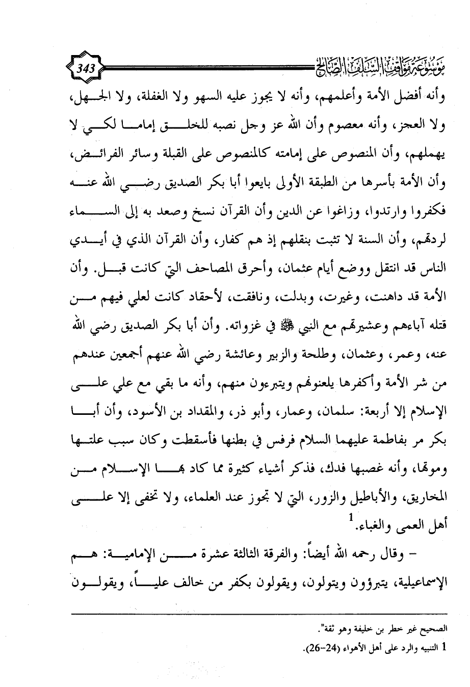 وأن أبا بكر الصديق رضي الله عنه، وعمر، وعثمان، وطلحة والزبير وعائشة رضي الله عنهم أجمعين عندهم من شر الأمة وأكفرها يلعنونهم ويتبرءون منهم، وأنه ما بقي مع علي على الإسلام إلا أربعة: سلمان، وعمار، وأبو ذر، والمقداد بن الأسود، وأن أبا بكر مر بفاطمة عليهما السلام فرفس في بطنها فأسقطت وكان سبب علتها وموتها، وأنه غصبها فدك، فذكر أشياء كثيرة مما كاد بها الإسلام من المخاريق، والأباطيل والزور، التي لا تجوز عند العلماء، ولا تخفى إلا على أهل العمى والغباء. (¬1)