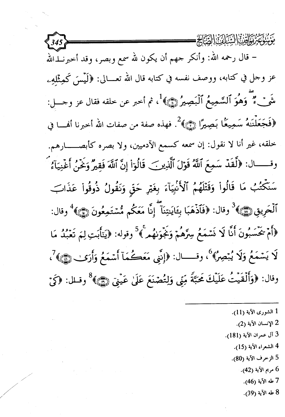 - قال رحمه الله: وأنكر جهم أن يكون لله سمع وبصر، وقد أخبرنا الله عز وجل في كتابه، ووصف نفسه في كتابه قال الله تعالى: {لَيْسَ كَمِثْلِهِ شَيْءٌ وَهُوَ السَّمِيعُ الْبَصِيرُ (11)} (¬1)، ثم أخبر عن خلقه فقال عز وجل: {فَجَعَلْنَاهُ سَمِيعًا بَصِيرًا (2)} (¬2). فهذه صفة من صفات الله أخبرنا أنها في خلقه، غير أنا لا نقول: إن سمعه كسمع الآدميين، ولا بصره كأبصارهم. وقال: {لَقَدْ سَمِعَ اللَّهُ قَوْلَ الَّذِينَ قَالُوا إِنَّ اللَّهَ فَقِيرٌ وَنَحْنُ أَغْنِيَاءُ سَنَكْتُبُ مَا قَالُوا وَقَتْلَهُمُ الْأَنْبِيَاءَ بِغَيْرِ حَقٍّ وَنَقُولُ ذُوقُوا عَذَابَ الْحَرِيقِ (181)} (¬3) وقال: {فَاذْهَبَا بِآَيَاتِنَا إِنَّا مَعَكُمْ مُسْتَمِعُونَ (15)} (¬4) وقال: {أَمْ يَحْسَبُونَ أَنَّا لَا نَسْمَعُ سِرَّهُمْ وَنَجْوَاهُمْ} (¬5) وقوله: {يَا أَبَتِ لِمَ تَعْبُدُ مَا لَا يَسْمَعُ وَلَا يُبْصِرُ} (¬6)، وقال: {إِنَّنِي مَعَكُمَا أَسْمَعُ وَأَرَى (46)} (¬7)، وقال: {وَأَلْقَيْتُ عَلَيْكَ مَحَبَّةً مِنِّي وَلِتُصْنَعَ عَلَى عَيْنِي (39)} (¬8) وقال: {كَيْ
