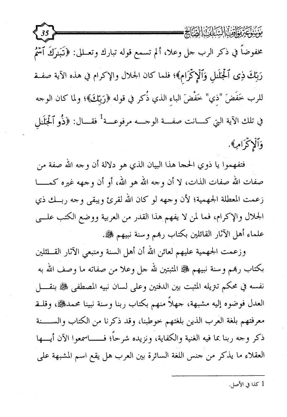 فتفهموا يا ذوي الحجا هذا البيان الذي هو دلالة أن وجه الله صفة من صفات الله صفات الذات، لا أن وجه الله هو الله، أو أن وجهه غيره كما زعمت المعطلة الجهمية؛ لأن وجهه لو كان الله لقرئ ويبقى وجه ربك ذي الجلال والإكرام، فما لمن لا يفهم هذا القدر من العربية ووضع الكتب على علماء أهل الآثار القائلين بكتاب ربهم وسنة نبيهم - صلى الله عليه وسلم -.