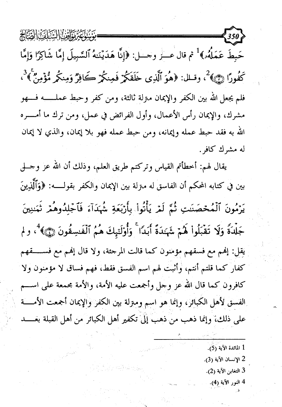 حَبِطَ عَمَلُهُ} (¬1) ثم قال عز وجل: {إِنَّا هَدَيْنَاهُ السَّبِيلَ إِمَّا شَاكِرًا وَإِمَّا كَفُورًا (3)} (¬2)، وقال: {هُوَ الَّذِي خَلَقَكُمْ فَمِنْكُمْ كَافِرٌ وَمِنْكُمْ مُؤْمِنٌ} (¬3)، فلم يجعل الله بين الكفر والإيمان منزلة ثالثة، ومن كفر وحبط عمله فهو مشرك، والإيمان رأس الأعمال، وأول الفرائض في عمل، ومن ترك ما أمره الله به فقد حبط عمله وإيمانه، ومن حبط عمله فهو بلا إيمان، والذي لا إيمان له مشرك كافر.