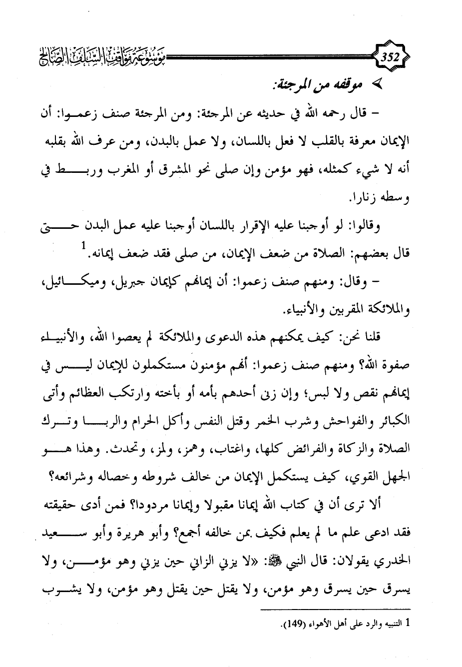 - قال رحمه الله في حديثه عن المرجئة: ومن المرجئة صنف زعموا: أن الإيمان معرفة بالقلب لا فعل باللسان، ولا عمل بالبدن، ومن عرف الله بقلبه أنه لا شيء كمثله، فهو مؤمن وإن صلى نحو المشرق أو المغرب وربط في وسطه زناراً.
