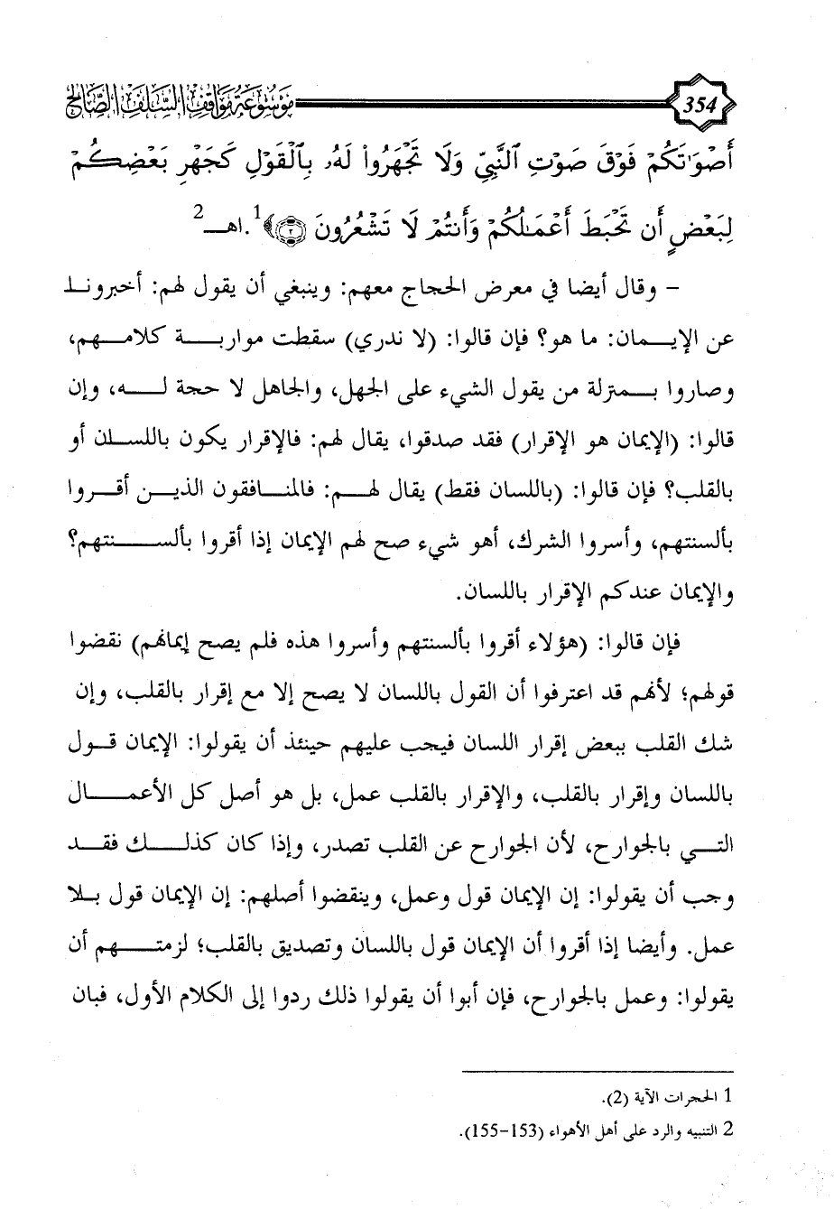 - وقال أيضاً في معرض الحجاج معهم: وينبغي أن يقول لهم: أخبرونا عن الإيمان: ما هو؟ فإن قالوا: (لا ندري) سقطت مواربة كلامهم، وصاروا بمنزلة من يقول الشيء على الجهل، والجاهل لا حجة له، وإن قالوا: (الإيمان هو الإقرار) فقد صدقوا، يقال لهم: فالإقرار يكون باللسان أو بالقلب؟ فإن قالوا: (باللسان فقط) يقال لهم: فالمنافقون الذين أقروا بألسنتهم، وأسروا الشرك، أهو شيء صح لهم الإيمان إذا أقروا بألسنتهم؟ والإيمان عندكم الإقرار باللسان.
