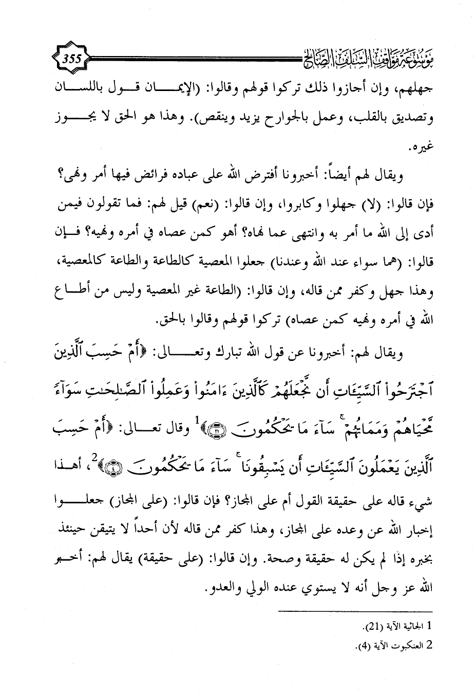 ويقال لهم أيضاً: أخبرونا أفترض الله على عباده فرائض فيها أمر ونهى؟ فإن قالوا: (لا) جهلوا وكابروا، وإن قالوا: (نعم) قيل لهم: فما تقولون فيمن أدى إلى الله ما أمر به وانتهى عما نهاه؟ أهو كمن عصاه في أمره ونهيه؟ فإن قالوا: (هما سواء عند الله وعندنا) جعلوا المعصية كالطاعة والطاعة كالمعصية، وهذا جهل وكفر ممن قاله، وإن قالوا: (الطاعة غير المعصية وليس من أطاع الله في أمره ونهيه كمن عصاه) تركوا قولهم وقالوا بالحق.