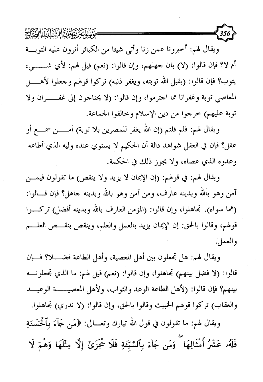 ويقال لهم: أخبرونا عمن زنا وأتى شيئاً من الكبائر أترون عليه التوبة أم لا؟ فإن قالوا: (لا) بَانَ جهلهم، وإن قالوا: (نعم) قيل لهم: لأي شيء يتوب؟ فإن قالوا: (يقبل الله توبته، ويغفر ذنبه) تركوا قولهم وجعلوا لأهل المعاصي توبة وغفراناً مما اجترموا، وإن قالوا: (لا يحتاجون إلى غفران ولا توبة عليهم) خرجوا من دين الإسلام وخالفوا الجماعة.