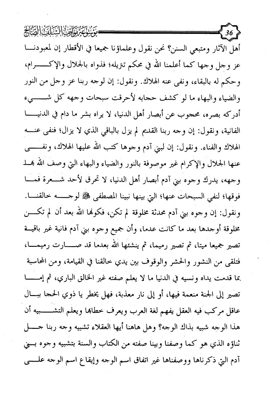 أهل الآثار ومتبعي السنن؟ نحن نقول وعلماؤنا جميعاً في الأقطار إن لمعبودنا عز وجل وجها كما أعلمنا الله في محكم تنزيله؛ فذواه بالجلال والإكرام، وحكم له بالبقاء، ونفى عنه الهلاك. ونقول: إن لوجه ربنا عز وجل من النور والضياء والبهاء ما لو كشف حجابه لأحرقت سبحات وجهه كل شيء أدركه بصره، محجوب عن أبصار أهل الدنيا، لا يراه بشر ما دام في الدنيا الفانية، ونقول: إن وجه ربنا القديم لم يزل بالباقي الذي لا يزال؛ فنفى عنه الهلاك والفناء. ونقول: إن لبني آدم وجوها كتب الله عليها الهلاك، ونفى عنها الجلال والإكرام غير موصوفة بالنور والضياء والبهاء التي وصف الله بها وجهه، يدرك وجوه بني آدم أبصار أهل الدنيا، لا تحرق لأحد شعرة فما فوقها؛ لنفي السبحات عنها؛ التي بينها نبينا المصطفى - صلى الله عليه وسلم - لوجه خالقنا.