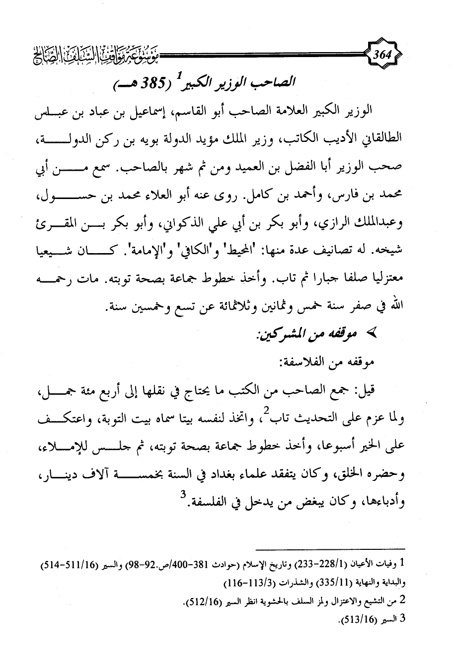 قيل: جمع الصاحب من الكتب ما يحتاج في نقلها إلى أربع مئة جمل، ولما عزم على التحديث تاب (¬2)، واتخذ لنفسه بيتاً سماه بيت التوبة، واعتكف على الخير أسبوعاً، وأخذ خطوط جماعة بصحة توبته، ثم جلس للإملاء، وحضره الخلق، وكان يتفقد علماء بغداد في السنة بخمسة آلاف دينار، وأدباءها، وكان يبغض من يدخل في الفلسفة. (¬3)