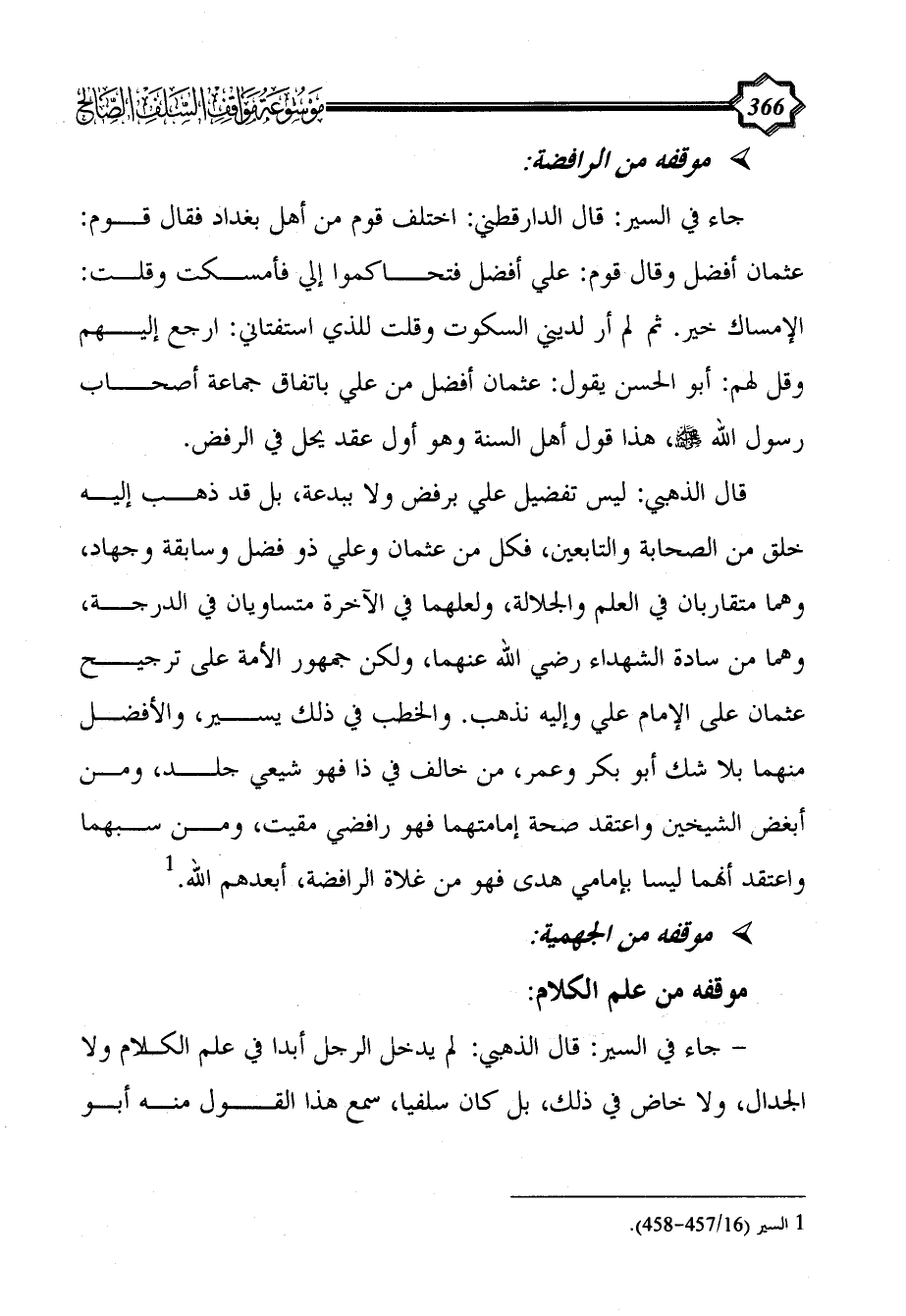 قال الذهبي: ليس تفضيل علي برفض ولا ببدعة، بل قد ذهب إليه خلق من الصحابة والتابعين، فكل من عثمان وعلي ذو فضل وسابقة وجهاد، وهما متقاربان في العلم والجلالة، ولعلهما في الآخرة متساويان في الدرجة، وهما من سادة الشهداء رضي الله عنهما، ولكن جمهور الأمة على ترجيح عثمان على الإمام علي وإليه نذهب. والخطب في ذلك يسير، والأفضل منهما بلا شك أبو بكر وعمر، من خالف في ذا فهو شيعي جلد، ومن أبغض الشيخين واعتقد صحة إمامتهما فهو رافضي مقيت، ومن سبهما واعتقد أنهما ليسا بإمامي هدى فهو من غلاة الرافضة، أبعدهم الله. (¬1)
