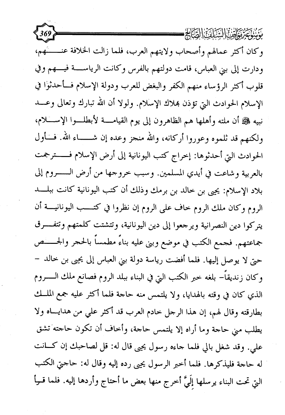 وكان أكثر عمالهم وأصحاب ولايتهم العرب، فلما زالت الخلافة عنهم، ودارت إلى بني العباس، قامت دولتهم بالفرس وكانت الرياسة فيهم وفي قلوب أكثر الرؤساء منهم الكفر والبغض للعرب ودولة الإسلام فأحدثوا في الإسلام الحوادث التي تؤذن بهلاك الإسلام. ولولا أن الله تبارك وتعالى وعد نبيه - صلى الله عليه وسلم - أن ملته وأهلها هم الظاهرون إلى يوم القيامة لأبطلوا الإسلام، ولكنهم قد ثلموه وعوروا أركانه، والله منجز وعده إن شاء الله. فأول الحوادث التي أحدثوها: إخراج كتب اليونانية إلى أرض الإسلام فترجمت بالعربية وشاعت في أيدي المسلمين. وسبب خروجها من أرض الروم إلى بلاد الإسلام: يحيى بن خالد بن برمك وذلك أن كتب اليونانية كانت ببلد الروم وكان ملك الروم خاف على الروم إن نظروا في كتب اليونانية أن يتركوا دين النصرانية ويرجعوا إلى دين اليونانية، وتتشتت كلمتهم وتتفرق جماعتهم. فجمع الكتب في موضع وبنى عليه بناءً مطمساً بالحجر والجص حتى لا يوصل إليها. فلما أفضت رياسة دولة بني العباس إلى يحيى بن خالد -وكان زنديقاً- بلغه خبر الكتب التي في البناء ببلد الروم فصانع ملك الروم الذي كان في وقته بالهدايا، ولا يلتمس منه حاجة فلما أكثر عليه جمع الملك بطارقته وقال لهم، إن هذا الرجل خادم العرب قد أكثر علي من هداياه ولا يطلب مني حاجة وما أراه إلا يلتمس حاجة، وأخاف أن تكون حاجته تشق علي. وقد شغل بالي فلما جاءه رسول يحيى قال له: قل لصاحبك إن كانت له حاجة فليذكرها.