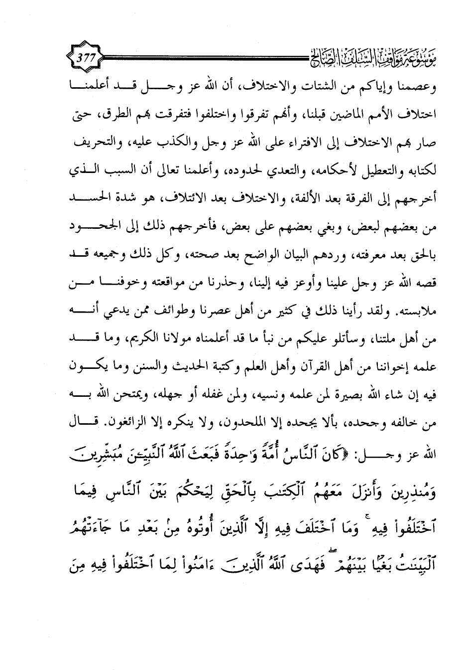 وعصمنا وإياكم من الشتات والاختلاف، أن الله عز وجل قد أعلمنا اختلاف الأمم الماضين قبلنا، وأنهم تفرقوا واختلفوا فتفرقت بهم الطرق، حتى صار بهم الاختلاف إلى الافتراء على الله عز وجل والكذب عليه، والتحريف لكتابه والتعطيل لأحكامه، والتعدي لحدوده، وأعلمنا تعالى أن السبب الذي أخرجهم إلى الفرقة بعد الألفة، والاختلاف بعد الائتلاف، هو شدة الحسد من بعضهم لبعض، وبغي بعضهم على بعض، فأخرجهم ذلك إلى الجحود بالحق بعد معرفته، وردهم البيان الواضح بعد صحته، وكل ذلك وجميعه قد قصه الله عز وجل علينا وأوعز فيه إلينا، وحذرنا من مواقعته وخوفنا من ملابسته. ولقد رأينا ذلك في كثير من أهل عصرنا وطوائف ممن يدعي أنه من أهل ملتنا، وسأتلو عليكم من نبأ ما قد أعلمناه مولانا الكريم، وما قد علمه إخواننا من أهل القرآن وأهل العلم وكتبة الحديث والسنن وما يكون فيه إن شاء الله بصيرة لمن علمه ونسيه، ولمن غفله أو جهله، ويمتحن الله به من خالفه وجحده، بألا يجحده إلا الملحدون، ولا ينكره إلا الزائغون. قال الله عز وجل: {كَانَ النَّاسُ أُمَّةً وَاحِدَةً فَبَعَثَ اللَّهُ النَّبِيِّينَ مُبَشِّرِينَ وَمُنْذِرِينَ وَأَنْزَلَ مَعَهُمُ الْكِتَابَ بِالْحَقِّ لِيَحْكُمَ بَيْنَ النَّاسِ فِيمَا اخْتَلَفُوا فِيهِ وَمَا اخْتَلَفَ فِيهِ إِلَّا الَّذِينَ أُوتُوهُ مِنْ بَعْدِ مَا جَاءَتْهُمُ الْبَيِّنَاتُ بَغْيًا بَيْنَهُمْ فَهَدَى اللَّهُ الَّذِينَ آَمَنُوا لِمَا اخْتَلَفُوا فِيهِ مِنَ