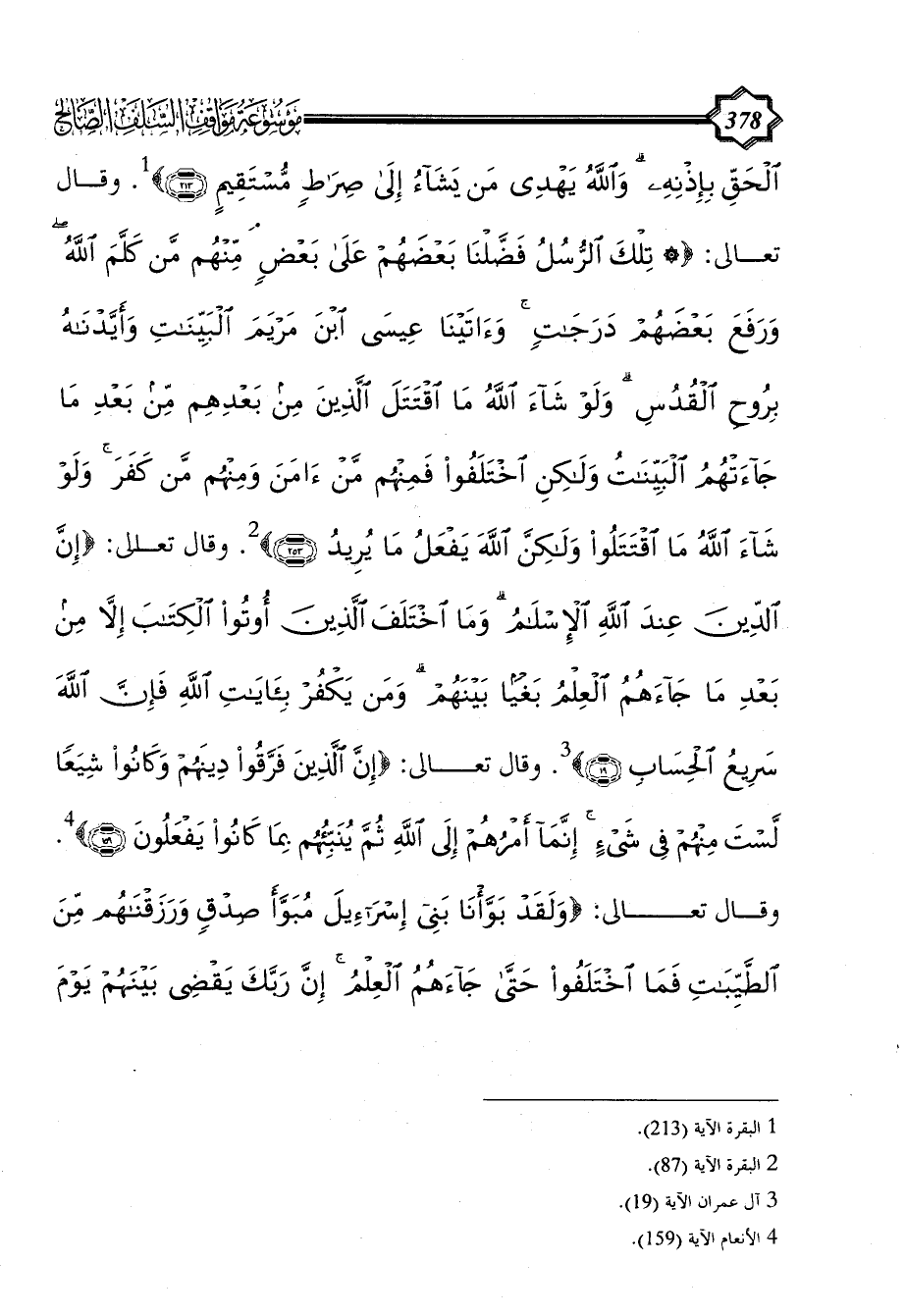 وقال تعالى: {* تِلْكَ الرُّسُلُ فَضَّلْنَا بَعْضَهُمْ عَلَى بَعْضٍ مِنْهُمْ مَنْ كَلَّمَ اللَّهُ وَرَفَعَ بَعْضَهُمْ دَرَجَاتٍ وَآَتَيْنَا عِيسَى ابْنَ مَرْيَمَ الْبَيِّنَاتِ وَأَيَّدْنَاهُ بِرُوحِ الْقُدُسِ وَلَوْ شَاءَ اللَّهُ مَا اقْتَتَلَ الَّذِينَ مِنْ بَعْدِهِمْ مِنْ بَعْدِ مَا جَاءَتْهُمُ الْبَيِّنَاتُ وَلَكِنِ اخْتَلَفُوا فَمِنْهُمْ مَنْ آَمَنَ وَمِنْهُمْ مَنْ كَفَرَ وَلَوْ شَاءَ اللَّهُ مَا اقْتَتَلُوا وَلَكِنَّ اللَّهَ يَفْعَلُ مَا يُرِيدُ (253)} (¬2). وقال تعالى: {إِنَّ الدِّينَ عِنْدَ اللَّهِ الْإِسْلَامُ وَمَا اخْتَلَفَ الَّذِينَ أُوتُوا الْكِتَابَ إِلَّا مِنْ بَعْدِ مَا جَاءَهُمُ الْعِلْمُ بَغْيًا بَيْنَهُمْ وَمَنْ يَكْفُرْ بِآَيَاتِ اللَّهِ فَإِن اللَّهَ سَرِيعُ الْحِسَابِ (19)} (¬3). وقال تعالى: {إِنَّ الَّذِينَ فَرَّقُوا دِينَهُمْ وَكَانُوا شِيَعًا لَسْتَ مِنْهُمْ فِي شَيْءٍ إِنَّمَا أَمْرُهُمْ إِلَى اللَّهِ ثُمَّ يُنَبِّئُهُمْ بِمَا كَانُوا يَفْعَلُونَ (159)} (¬4). وقال تعالى: {وَلَقَدْ بَوَّأْنَا بَنِي إِسْرَائِيلَ مُبَوَّأَ صِدْقٍ وَرَزَقْنَاهُمْ مِنَ الطَّيِّبَاتِ فَمَا اخْتَلَفُوا حَتَّى جَاءَهُمُ الْعِلْمُ إِنَّ رَبَّكَ يَقْضِي بَيْنَهُمْ يَوْمَ