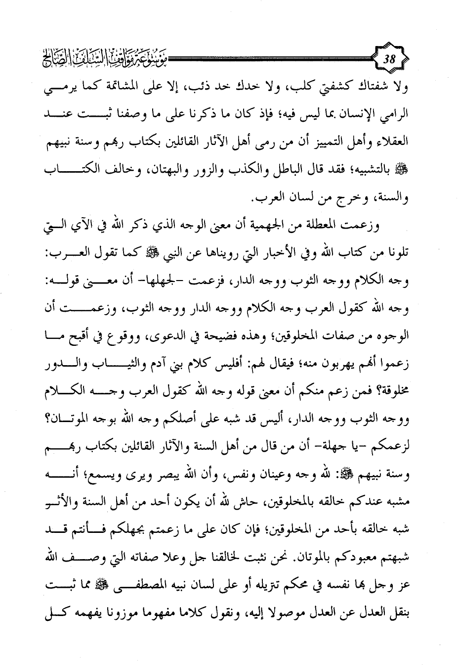 وزعمت المعطلة من الجهمية أن معنى الوجه الذي ذكر الله في الآي التي تلونا من كتاب الله وفي الأخبار التي رويناها عن النبي - صلى الله عليه وسلم - كما تقول العرب: وجه الكلام ووجه الثوب ووجه الدار، فزعمت -لجهلها- أن معنى قوله: وجه الله كقول العرب وجه الكلام ووجه الدار ووجه الثوب، وزعمت أن الوجوه من صفات المخلوقين؛ وهذه فضيحة في الدعوى، ووقوع في أقبح ما زعموا أنهم يهربون منه؛ فيقال لهم: أفليس كلام بني آدم والثياب والدور مخلوقة؟ فمن زعم منكم أن معنى قوله وجه الله كقول العرب وجه الكلام ووجه الثوب ووجه الدار، أليس قد شبه على أصلكم وجه الله بوجه الموتان؟ لزعمكم -يا جهلة- أن من قال من أهل السنة والآثار القائلين بكتاب ربهم وسنة نبيهم - صلى الله عليه وسلم -: لله وجه وعينان ونفس، وأن الله يبصر ويرى ويسمع؛ أنه مشبه عندكم خالقه بالمخلوقين، حاش لله أن يكون أحد من أهل السنة والأثر شبه خالقه بأحد من المخلوقين؛ فإن كان على ما زعمتم بجهلكم فأنتم قد شبهتم معبودكم بالموتان. نحن نثبت لخالقنا جل وعلا صفاته التي وصف الله عز وجل بها نفسه في محكم تنزيله أو على لسان نبيه المصطفى - صلى الله عليه وسلم - مما ثبت بنقل العدل عن العدل موصولاً إليه، ونقول كلاماً مفهوماً موزوناً يفهمه كل