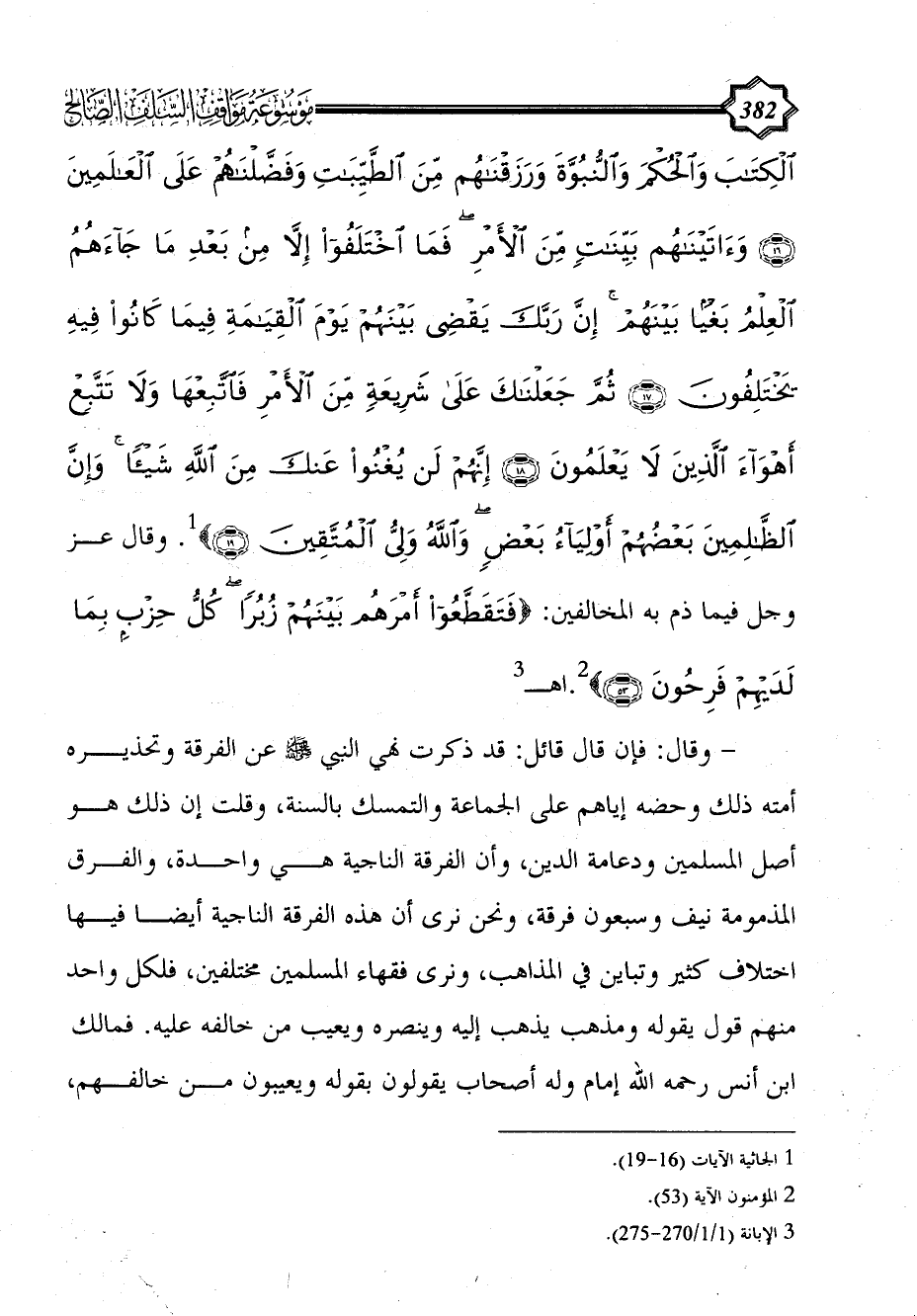 الْكِتَابَ وَالْحُكْمَ وَالنُّبُوَّةَ وَرَزَقْنَاهُمْ مِنَ الطَّيِّبَاتِ وَفَضَّلْنَاهُمْ عَلَى الْعَالَمِينَ (16) وَآَتَيْنَاهُمْ بَيِّنَاتٍ مِنَ الْأَمْرِ فَمَا اخْتَلَفُوا إِلَّا مِنْ بَعْدِ مَا جَاءَهُمُ الْعِلْمُ بَغْيًا بَيْنَهُمْ إِنَّ رَبَّكَ يَقْضِي بَيْنَهُمْ يَوْمَ الْقِيَامَةِ فِيمَا كَانُوا فِيهِ يَخْتَلِفُونَ (17) ثُمَّ جَعَلْنَاكَ عَلَى شَرِيعَةٍ مِنَ الْأَمْرِ فَاتَّبِعْهَا وَلَا تَتَّبِعْ أَهْوَاءَ الَّذِينَ لَا يَعْلَمُونَ (18) إِنَّهُمْ لَنْ يُغْنُوا عَنْكَ مِنَ اللَّهِ شَيْئًا وَإِنَّ الظَّالِمِينَ بَعْضُهُمْ أَوْلِيَاءُ بَعْضٍ وَاللَّهُ وَلِيُّ الْمُتَّقِينَ (19)} (¬1). وقال عز وجل فيما ذم به المخالفين: {فَتَقَطَّعُوا أَمْرَهُمْ بَيْنَهُمْ زُبُرًا كُلُّ حِزْبٍ بِمَا لَدَيْهِمْ فَرِحُونَ (53)} (¬2).اهـ (¬3)