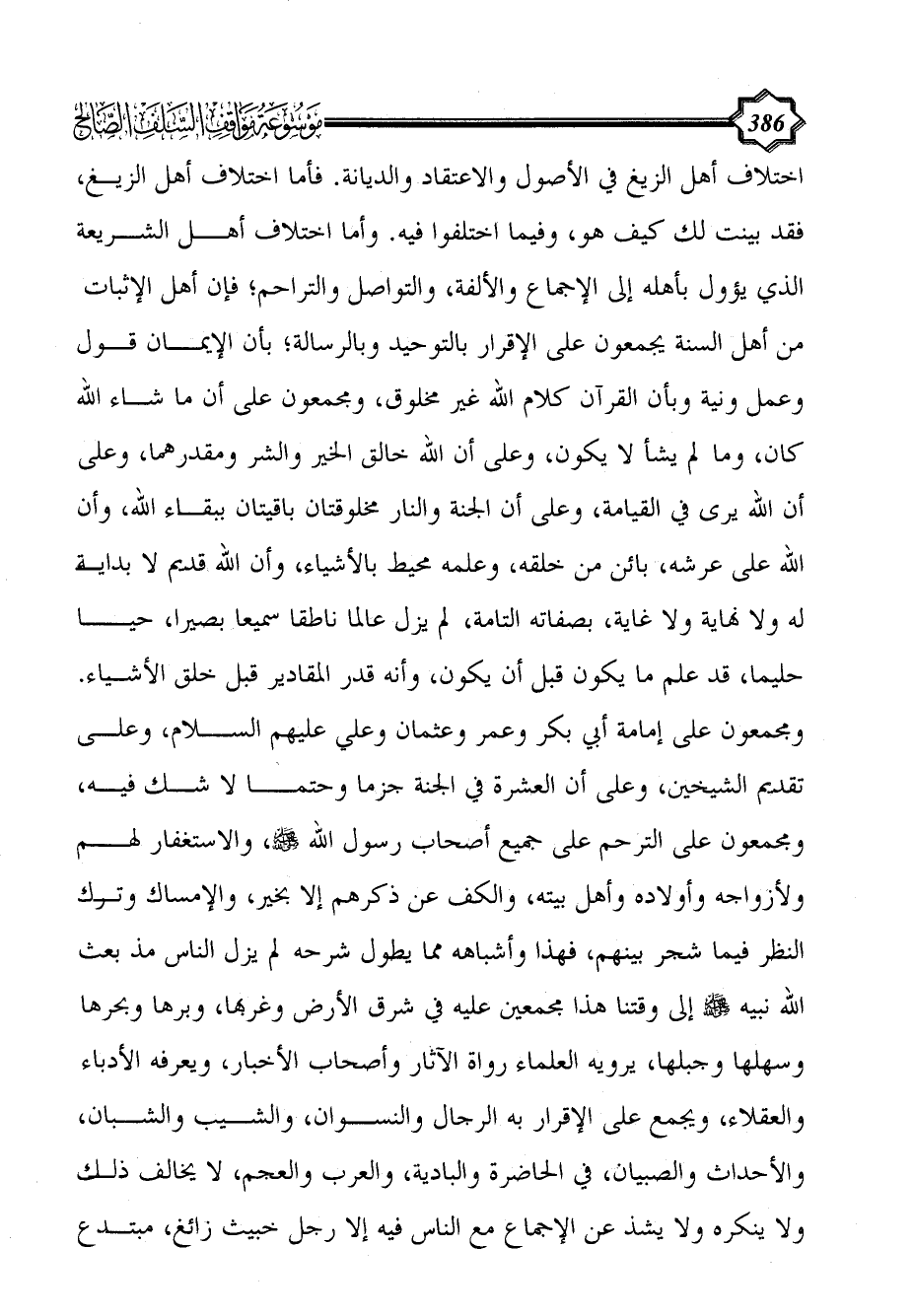 ومجمعون على إمامة أبي بكر وعمر وعثمان وعلي عليهم السلام، وعلى تقديم الشيخين، وعلى أن العشرة في الجنة جزماً وحتماً لا شك فيه، ومجمعون على الترحم على جميع أصحاب رسول الله - صلى الله عليه وسلم -، والاستغفار لهم ولأزواجه وأولاده وأهل بيته، والكف عن ذكرهم إلا بخير، والإمساك وترك النظر فيما شجر بينهم، فهذا وأشباهه مما يطول شرحه لم يزل الناس مذ بعث الله نبيه - صلى الله عليه وسلم - إلى وقتنا هذا مجمعين عليه في شرق الأرض وغربها، وبرها وبحرها وسهلها وجبلها، يرويه العلماء رواة الآثار وأصحاب الأخبار، ويعرفه الأدباء والعقلاء، ويجمع على الإقرار به الرجال والنسوان، والشيب والشبان، والأحداث والصبيان، في الحاضرة والبادية، والعرب والعجم، لا يخالف ذلك ولا ينكره ولا يشذ عن الإجماع مع الناس فيه إلا رجل خبيث زائغ، مبتدع