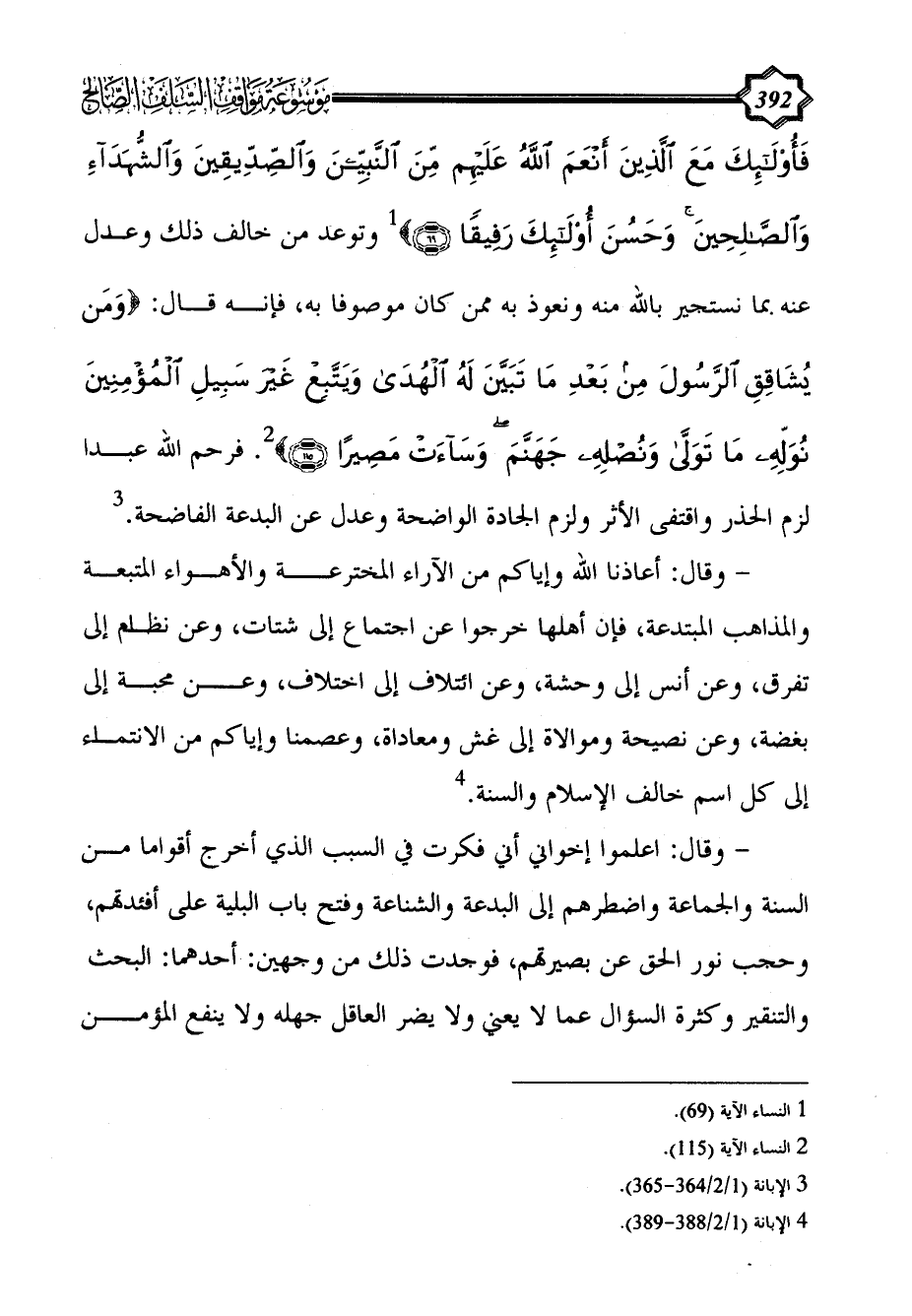 فَأُولَئِكَ مَعَ الَّذِينَ أَنْعَمَ اللَّهُ عَلَيْهِمْ مِنَ النَّبِيِّينَ وَالصِّدِّيقِينَ وَالشُّهَدَاءِ وَالصَّالِحِينَ وَحَسُنَ أُولَئِكَ رَفِيقًا (69)} (¬1) وتوعد من خالف ذلك وعدل عنه بما نستجير بالله منه ونعوذ به ممن كان موصوفاً به، فإنه قال: {وَمَنْ يُشَاقِقِ الرَّسُولَ مِنْ بَعْدِ مَا تَبَيَّنَ لَهُ الْهُدَى وَيَتَّبِعْ غَيْرَ سَبِيلِ الْمُؤْمِنِينَ نُوَلِّهِ مَا تَوَلَّى وَنُصْلِهِ جَهَنَّمَ وَسَاءَتْ مَصِيرًا (115)} (¬2). فرحم الله عبداً لزم الحذر واقتفى الأثر ولزم الجادة الواضحة وعدل عن البدعة الفاضحة. (¬3)